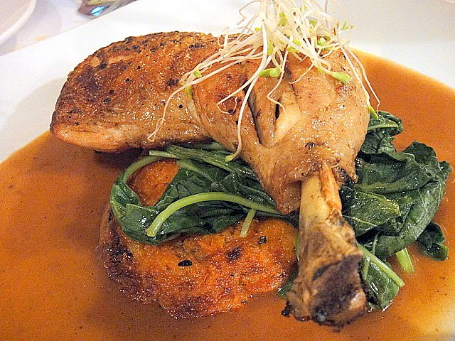 Fowl at its finest: chicken stewed in white wine, then pan-fried & partnered with a sweet potato pancake. Stunningly succulent, fabulously flavorful.