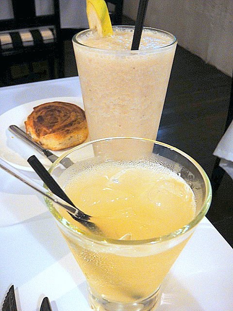 Crazysexycool cocktails: Banana Cake (rum, kahlua, banana, coconut milk, cinnamon), alongside Dark & Stormy (dark rum, ginger beer, fresh lime).