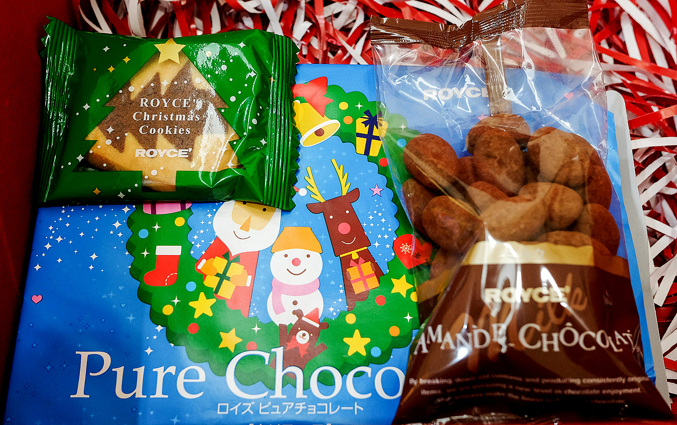 There's plenty of discover & desire in this Christmas Bundle, sufficient to satisfy family & friends through Dec. 25 & well into the New Year: Individually wrapped pure chocolate discs made with rich Hokkaido milk & luscious cocoa; roasted almonds blanketed in smooth milk chocolate; golden cookies coated with chocolate on one side & coconut flakes on the other; buttery cookies beautifully patterned with chocolate; fruity & nutty crunchy chocolate bars; light chocolate wafers; & much more.
