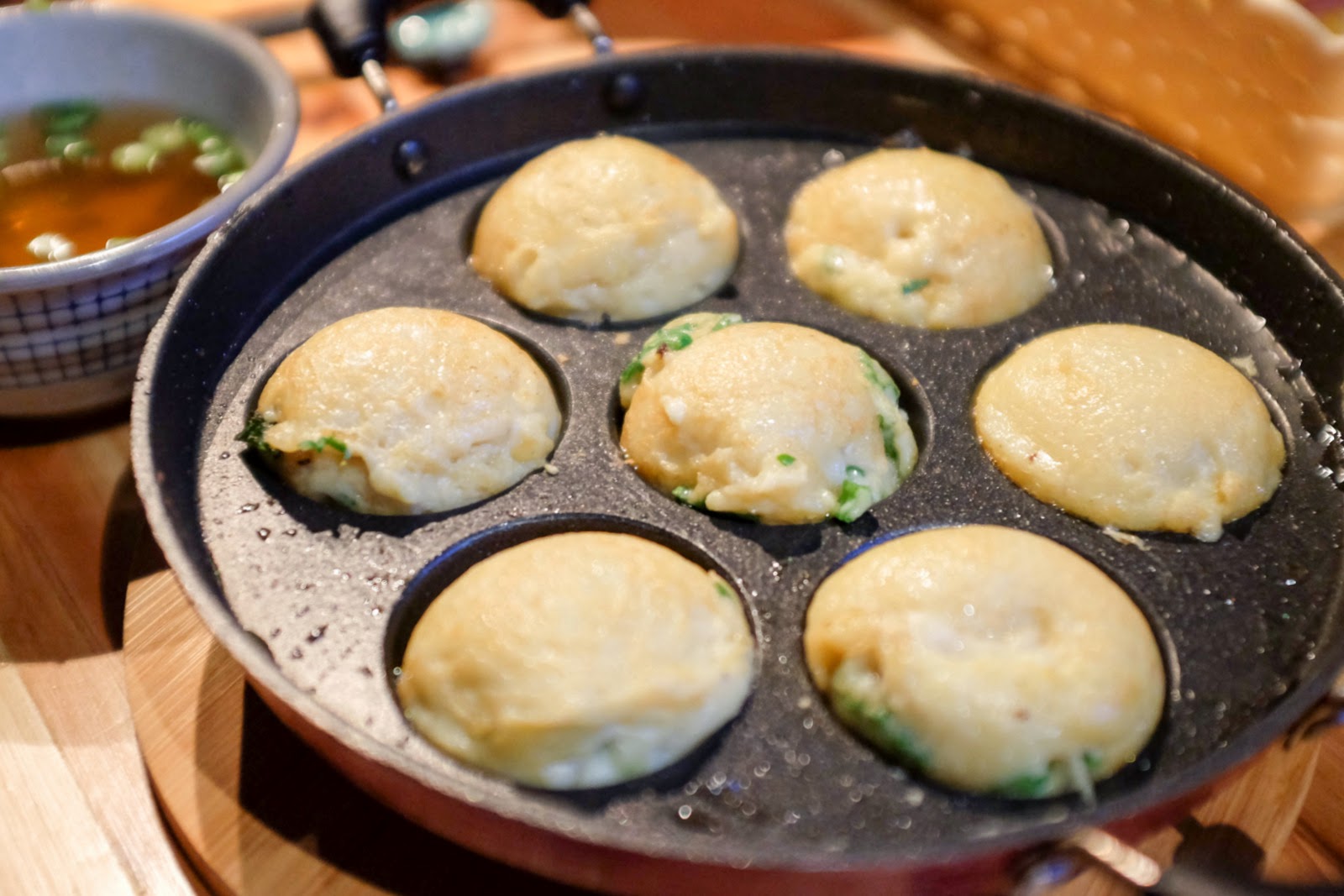 The spirit of home-style recipes is also imbued in the 'akashiyaki,' named for Japan's southern city of Akashi. Round dumplings made with an eggy batter, tinged with octopus tentacles - evocative of takoyaki, with a softer, somewhat fluffier texture. RM15 for a serving of seven pieces.