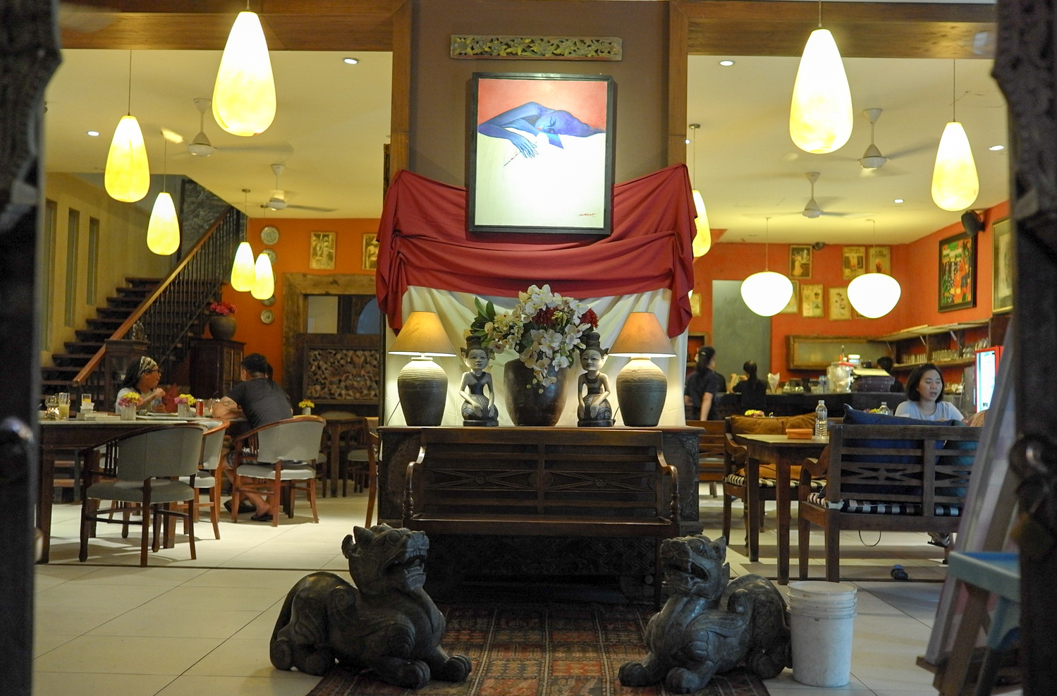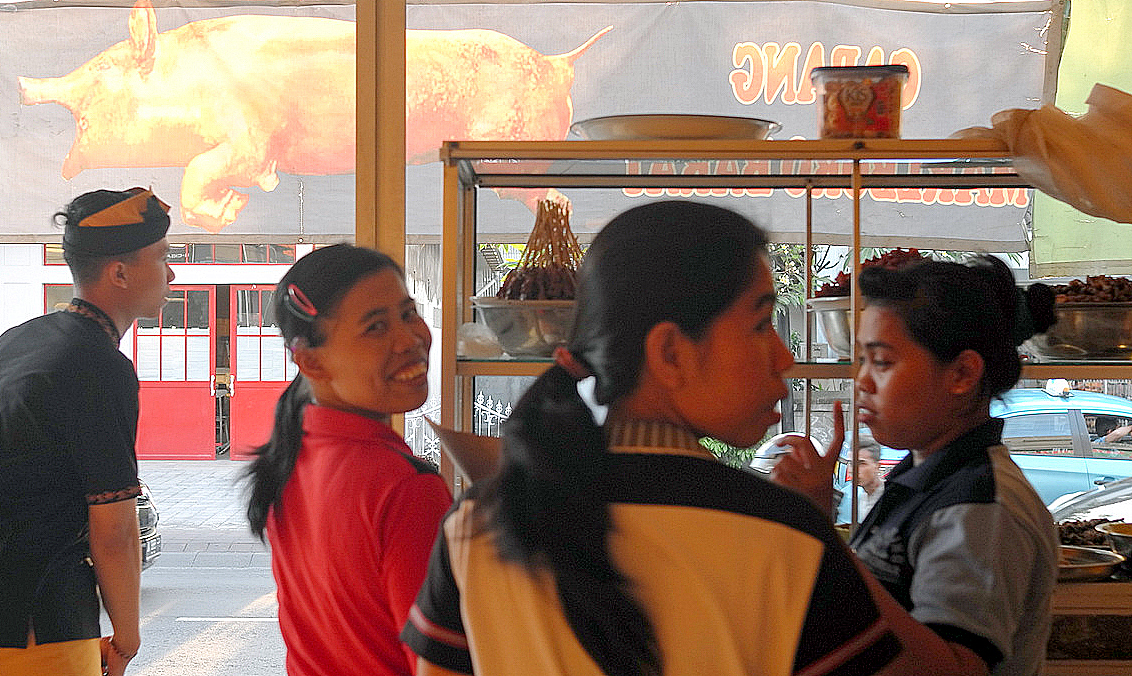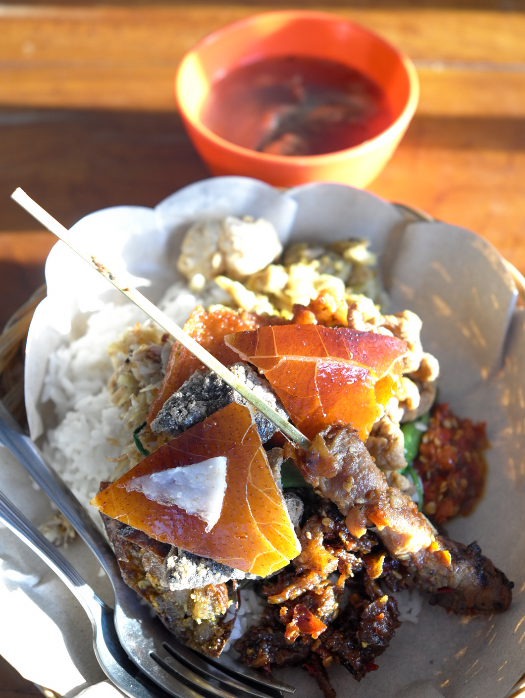 Food crawlers in Bali's Kerobokan enclave should consider these two venues for a taste of some of the island's best-loved specialities: First, Sari Kembar, a well-respected babi guling specialist - the complete rice platter comprises plenty of thick-skinned slices of roasted suckling pig, partnered with crackling, an aromatic meat skewer, rustic sausage bits, lots of spiced offal, vegetables and sambal for an utterly fulfilling meal that's packed with flavour and texture.