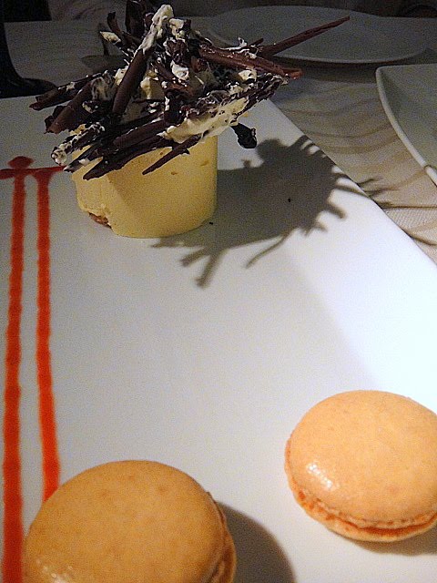 Mango parfait with chocolate crunch & coconut macarons.