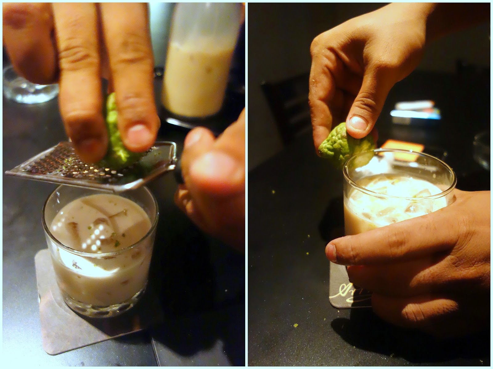 Guinness stout, Angostura 7-year-old rum, condensed milk, nutmeg & freshly grated kaffir lime combine forces for a real treat; silky-smooth & easy to drink, with a beery aftertaste. Crowd-pleasing, for certain.
