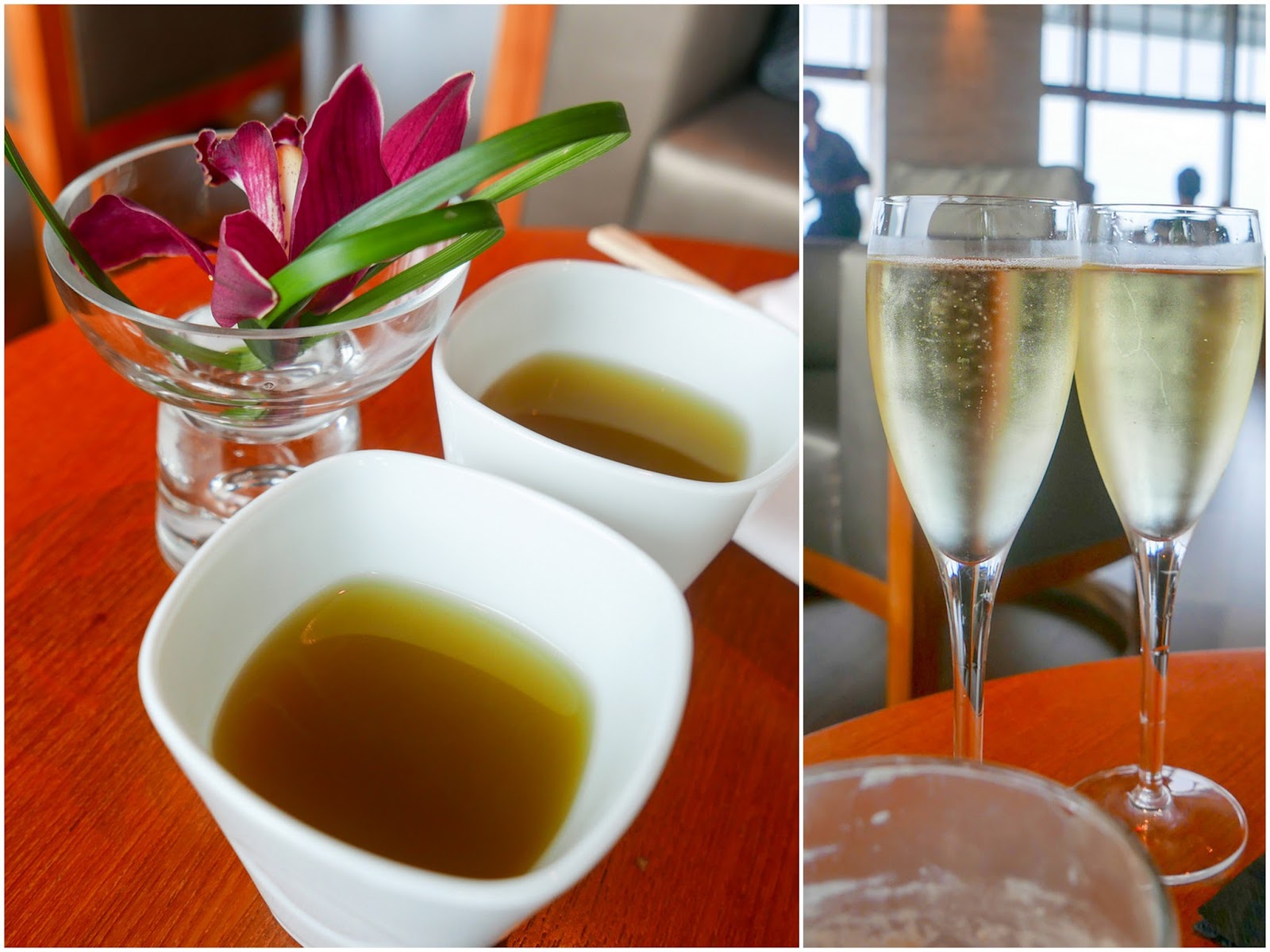 It's a high tea with an oceanic difference, with each creation meticulously crafted out of the sea's bounty. We ended up enjoying the entire ensemble - a delicate tiradito of fleshy white fish sashimi buoyed with the zing of yuzu, lemon juice, roccoto, soy salt & coriander; a spoonful of ultra-fresh minced salmon tartar in wasabi soy sauce; a cup of sushi rice crowned with ikura & shredded seaweed; deep-fried assorted crunchy seaweed crackers; warm gyoza stuffed with a luscious medley of prawns, white fish & salmon with spicy garlic paste & jalapeno dressing; & perhaps our favourite, terrifically textured sliders of juicy pan-seared shrimp made nuanced with onion tempura, mushrooms, 'umami' ketchup & truffle aioli sandwiched in tofu buns.