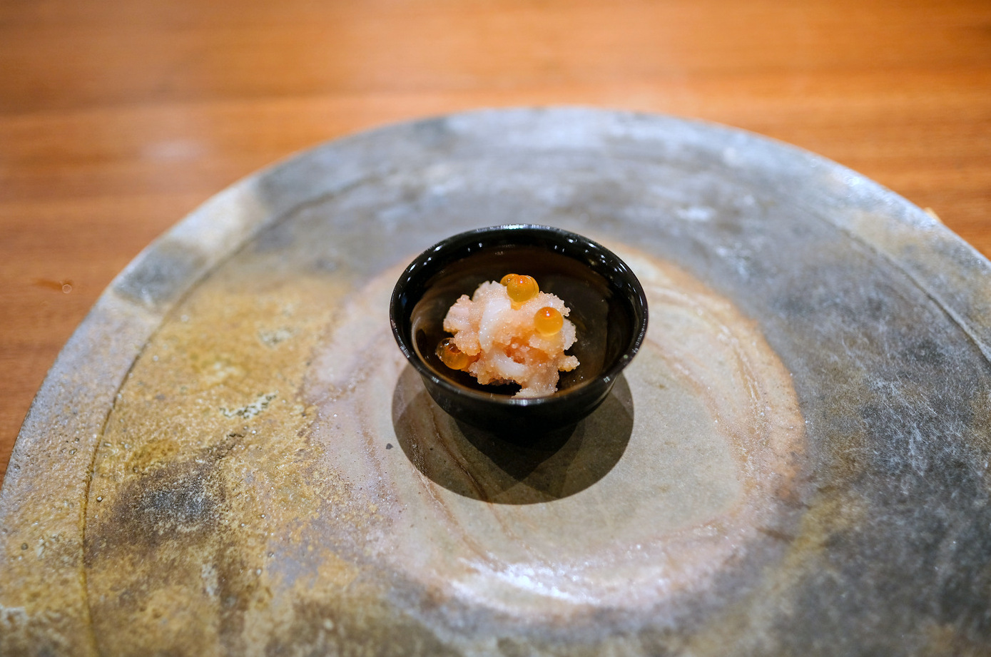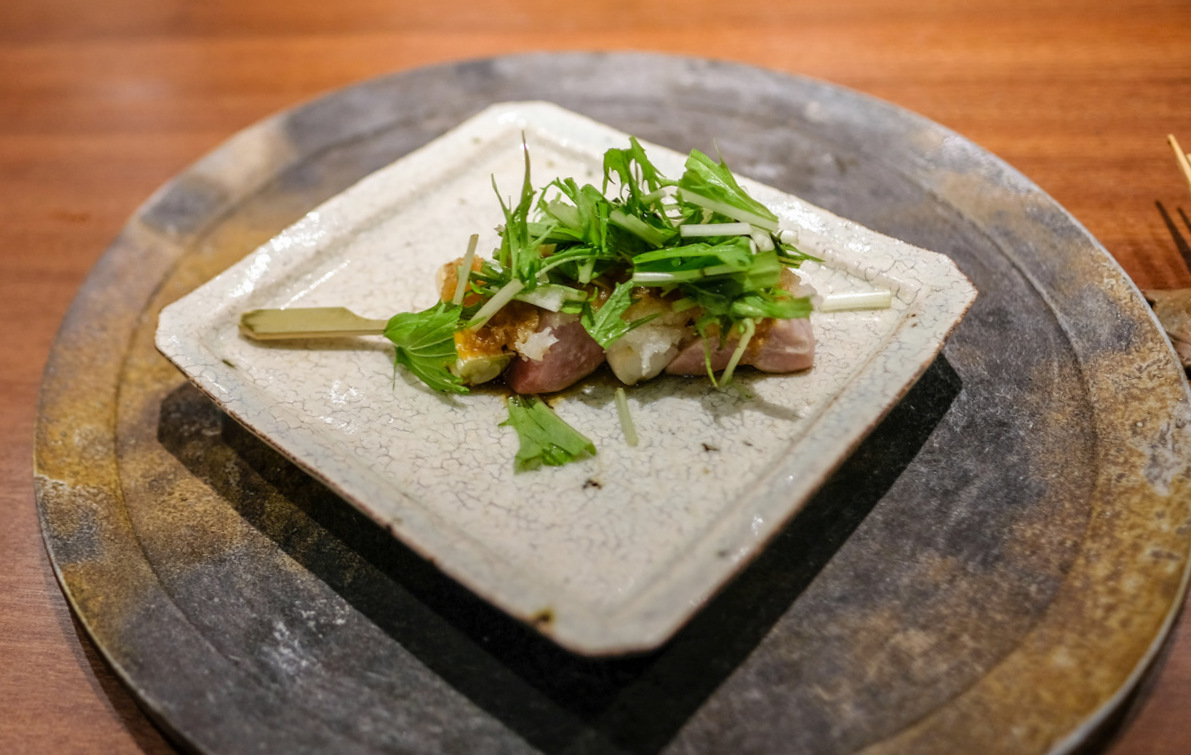 Subsequent seafood courses display delicately captivating flavours, consistently well-balanced with sprightly accompaniments from the land. Our sashimi plate comprised what the chef called 'the king of whitefish,' alongside slices of scallops and octopus, with sea urchin as a compellingly lovely bonus, representing a range of textures to relish. We also liked the tuna 'satay,' a tender, fleshy skewer with the crunch of leeks; the bonito with ponzu sauce and spring onions; and the squid coated in two kinds of roe. The affable chef exudes an exuberant joy in presenting each serving, and that enthusiasm is infectious.