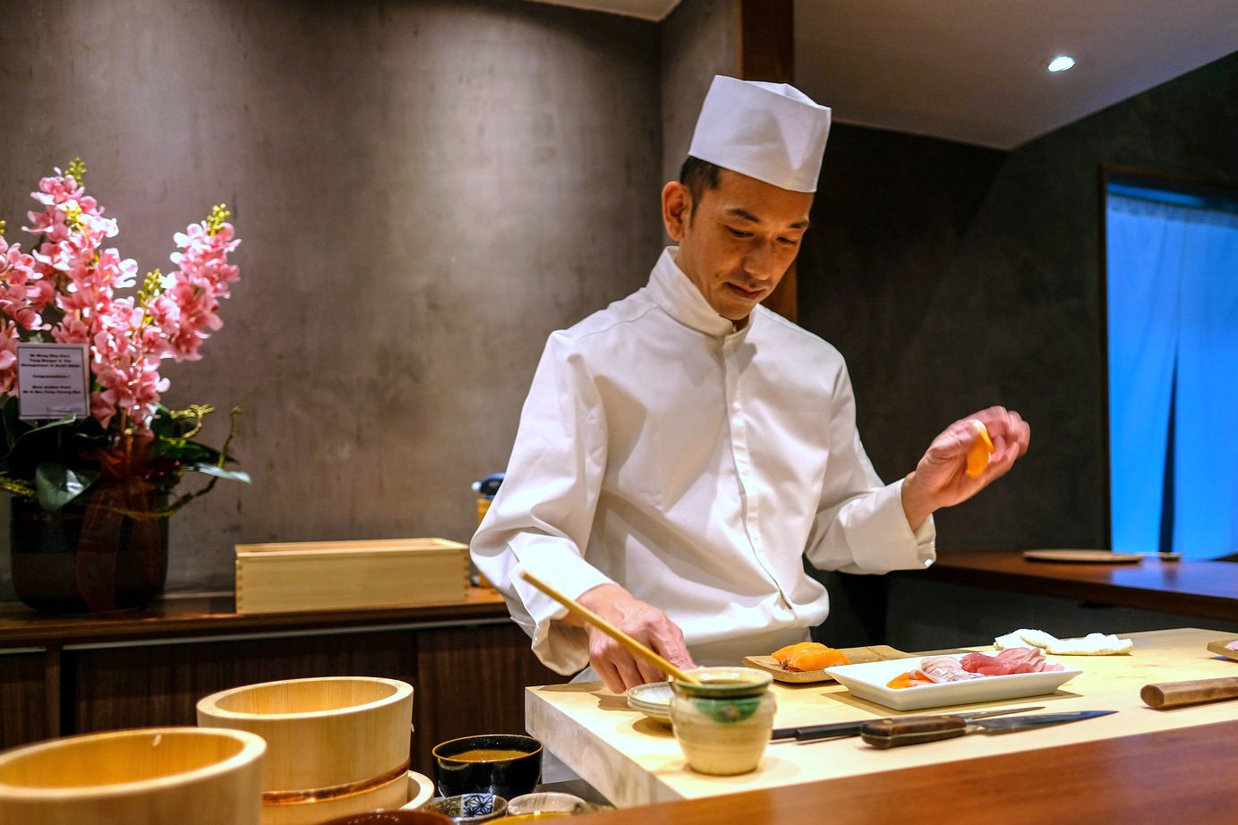 Some chefs wait a lifetime, for a moment like this: Sushi maestro Makoto 'Sam' Saito has spent over two decades honing his craft, from his home city of Tokyo through stints that have spanned Sydney to Rome, Tel Aviv to Kuala Lumpur. This month, he finally opens up his own sushi bar in Malaysia, Hibiki (Japanese for echo), which resonated with laughter and excitement on a recent weeknight. It might be tucked inside a shopping mall, but it's a relaxed, intimate space with a cosy charm.