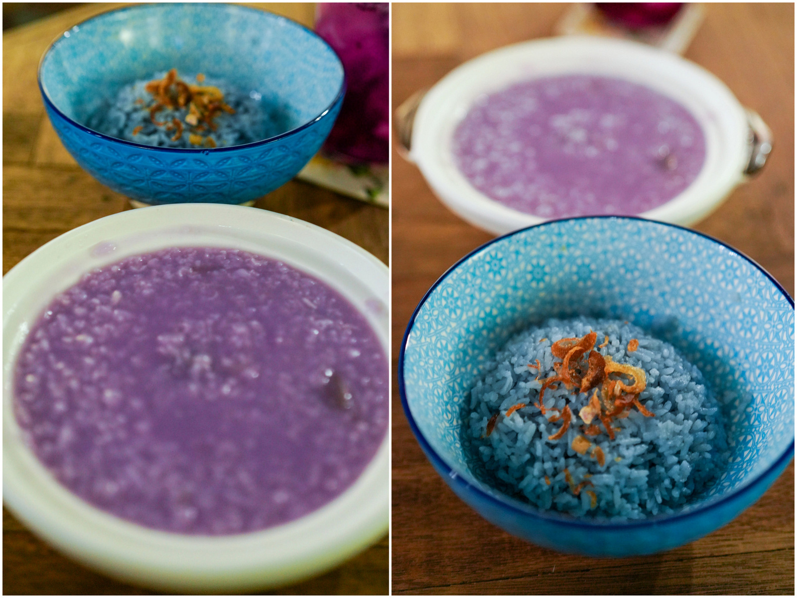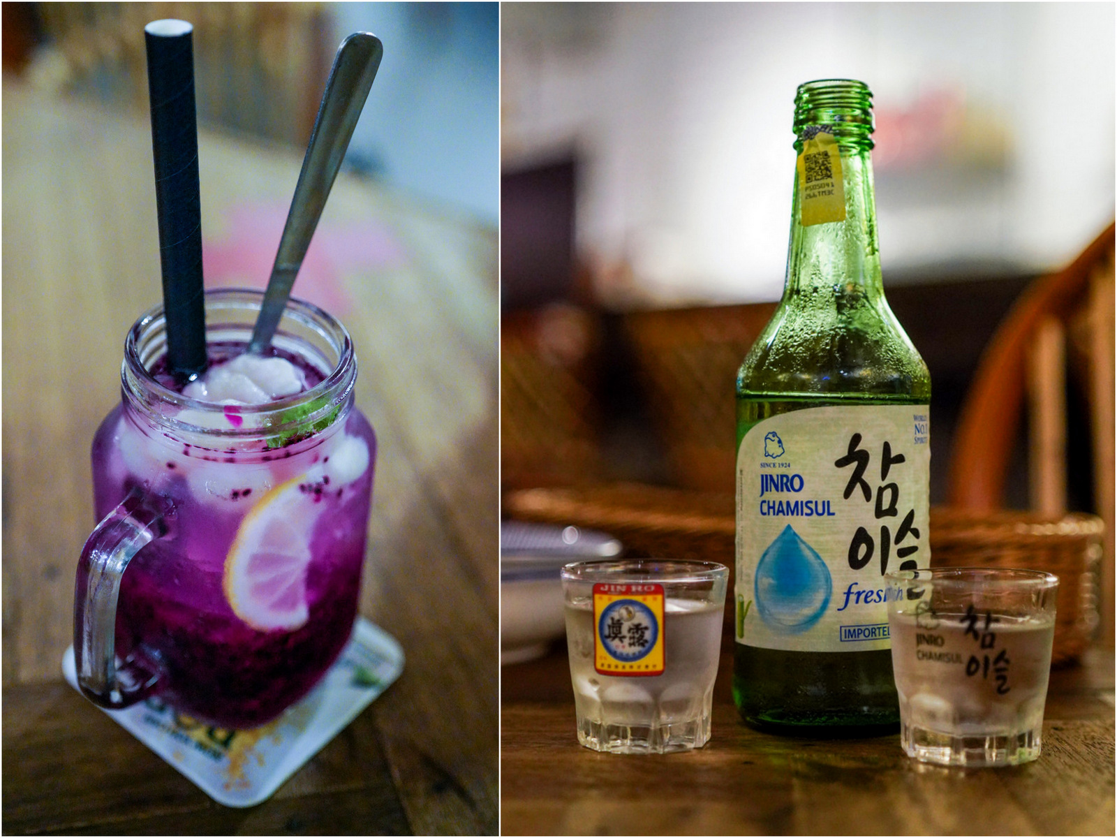 Starchy selections span the purple and blue, the former represented by soft, baby-food-textured sweet potato porridge (RM1.45), the latter by fragrant butterfly pea-hued nasi lemak (RM1.95). The purple reign persists with the Ai Yu dragonfruit soursop drink (RM4.95); for an alcoholic kick, Korean chamisul soju is available (RM19.95).