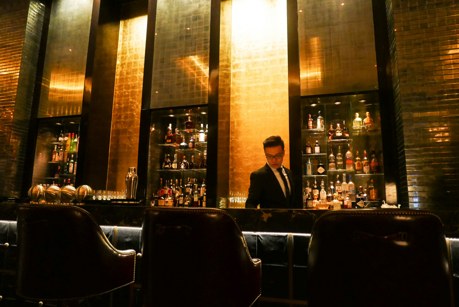 Custom-made panels glide open to reveal the entrance to The St. Regis Kuala Lumpur's flagship bar, an imposing scene made luxurious with marble, brass & leather, showcasing the sultry sophistication of signature cocktails like The Rat Pack Rusty Nail (RM65; a theatrics-filled tribute to Sinatra & Co - Maker's Mark Bourbon, Drambuie, triple sec & bitters, imbued with the depth of smoked hickory), materialising with a vaporous introduction at the table.