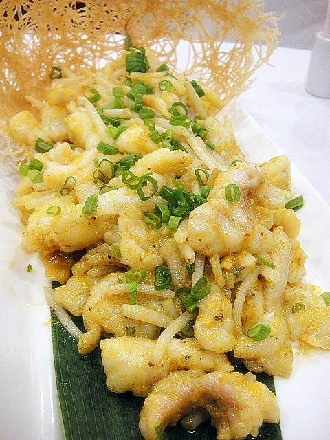 Stir-fried shredded fish with silver sprouts. Another intriguing item; tender but unidentifiable fish, complemented by a gentle, not-too-salty coat of egg yolk.