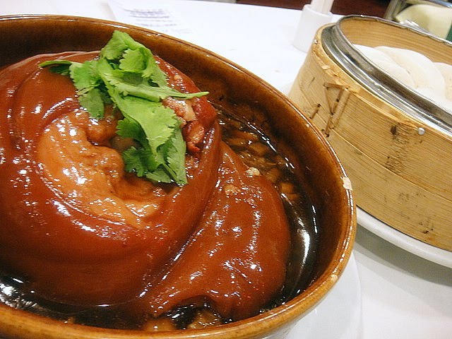 "Tong bo" pork trotter with 'silver roll' bread. Gelatinous fat and melt-in-the-mouth meat, braised in a preserved veggie broth that was good to the last slurp. What's not to love?