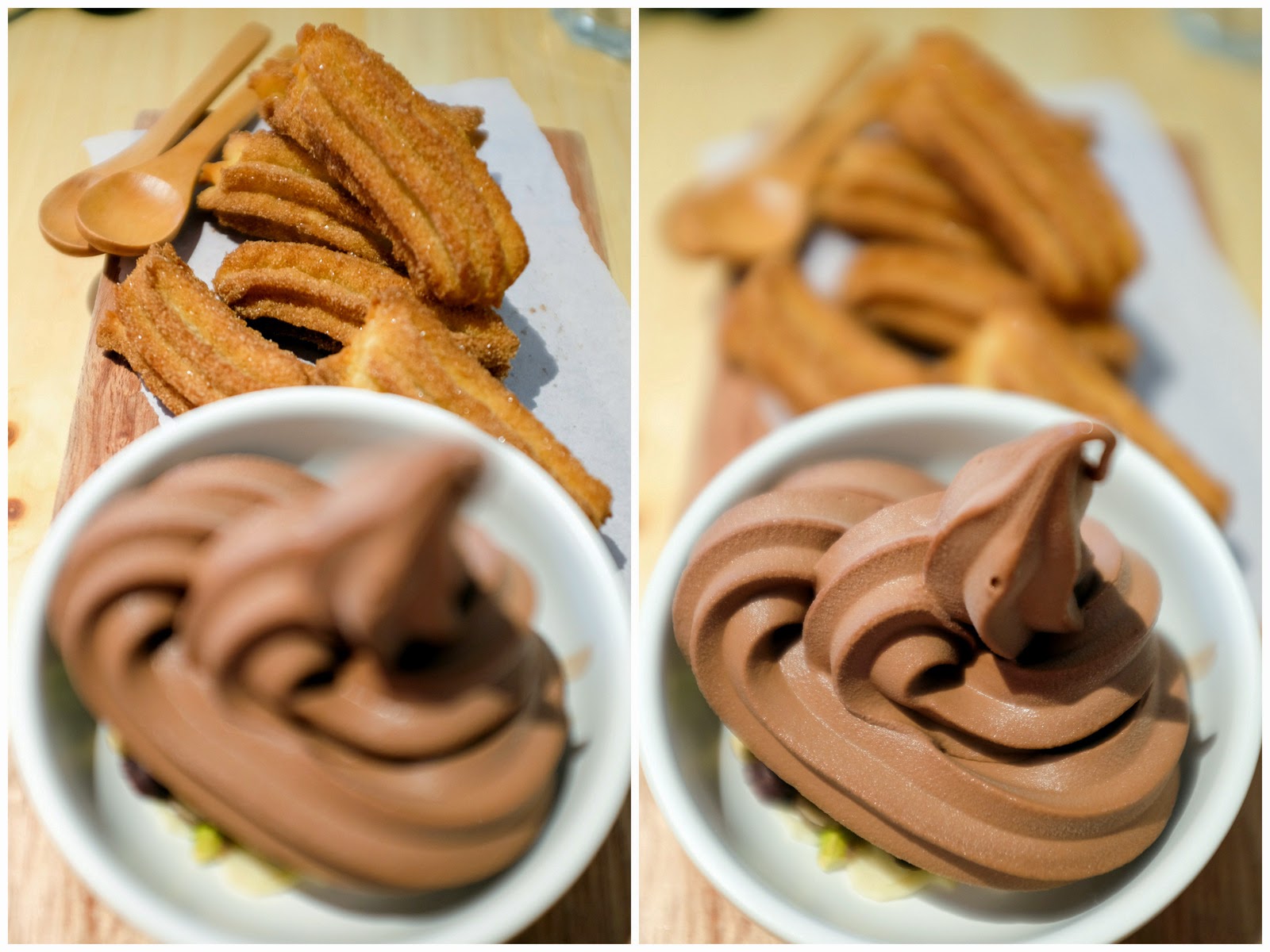 Chocolate ice cream pairs with warm churros for culinary contrast, with the unexpected pleasure of pistachios & seeds in the soft-serve. Note that Softsrve's churros are the densely chewy sort, far from delicately fluffy, with a potent punch of cinnamon. There are things that we'd tweak about the fare here, but that's a matter of preference. This is a strong, solid start for Softsrve.