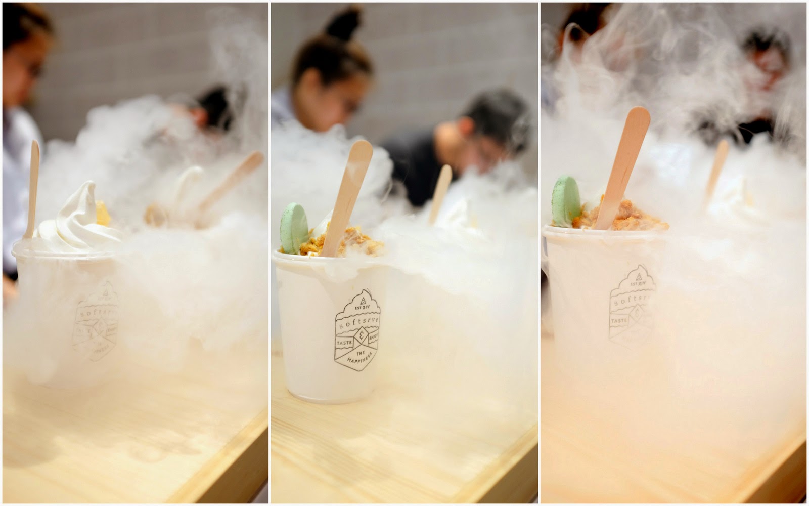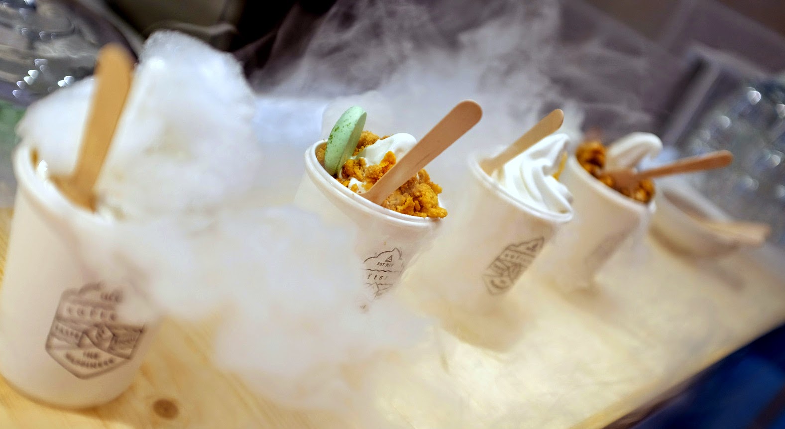 Check out the show - here's a peek at how the ice cream is presented to patrons, with lots of fog surging out of each serving, evocative of liquid nitrogen ice cream. The not-so-secret explanation here is dry ice; the soft-serve is placed in two overlapping cups, with the bigger cup at the base concealing dry ice that also keeps the containers cool a bit longer. Thoughtful touches.