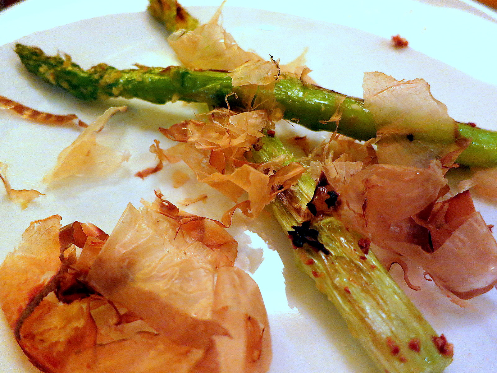 Asparagus with bonito flakes pays off for folks seeking something a little less sinful.