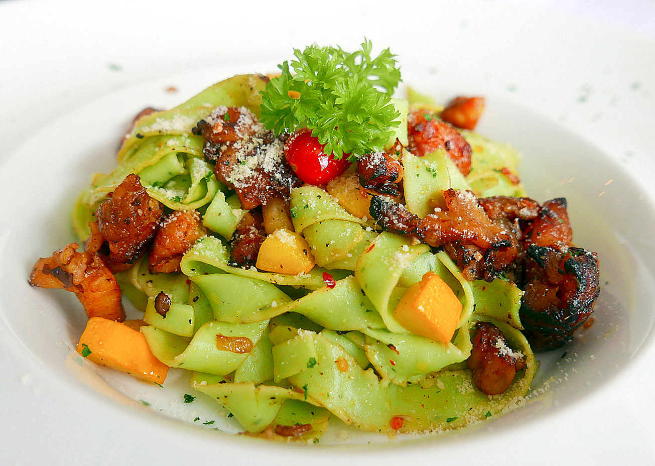 Green is good - Centella Kitchen's most intriguing temptations comprise fusion recipes with leafy hues: A Caesar salad bolstered by the crunch of Malaysian winged beans, or kacang botol (RM9); fettuccine infused with the restaurant's herbaceous namesake - centella, pegaga, or Asiatic pennywort - & tossed with pieces of chicken satay in a mildly garlicky sauce (RM16.90); & fruit mocktails, also tinged with centella extract (RM10.90). Respectable flavours for a satisfactory lunch.