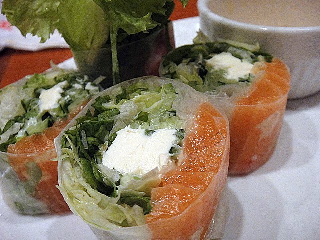 Salmon, cream cheese & veggies in rice paper. Look mom, no carbs! Well, almost anyway.