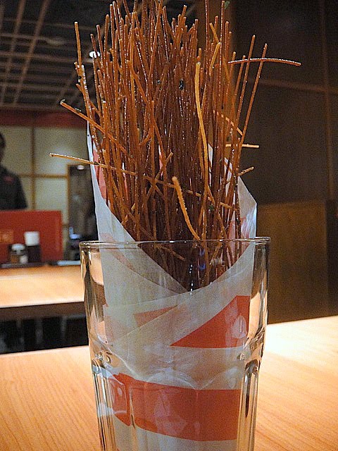 A staggering selection is offered; it's not fine dining, but some interesting items are available, such as this crispy capellini pasta (nope, it's not part of the table decoration). A bar snack with a Japanese twist, boasting an infusion of umami, possibly thanks to some seaweed. Be careful while chewing these; they're sharp enough to poke a hole through your gums!
