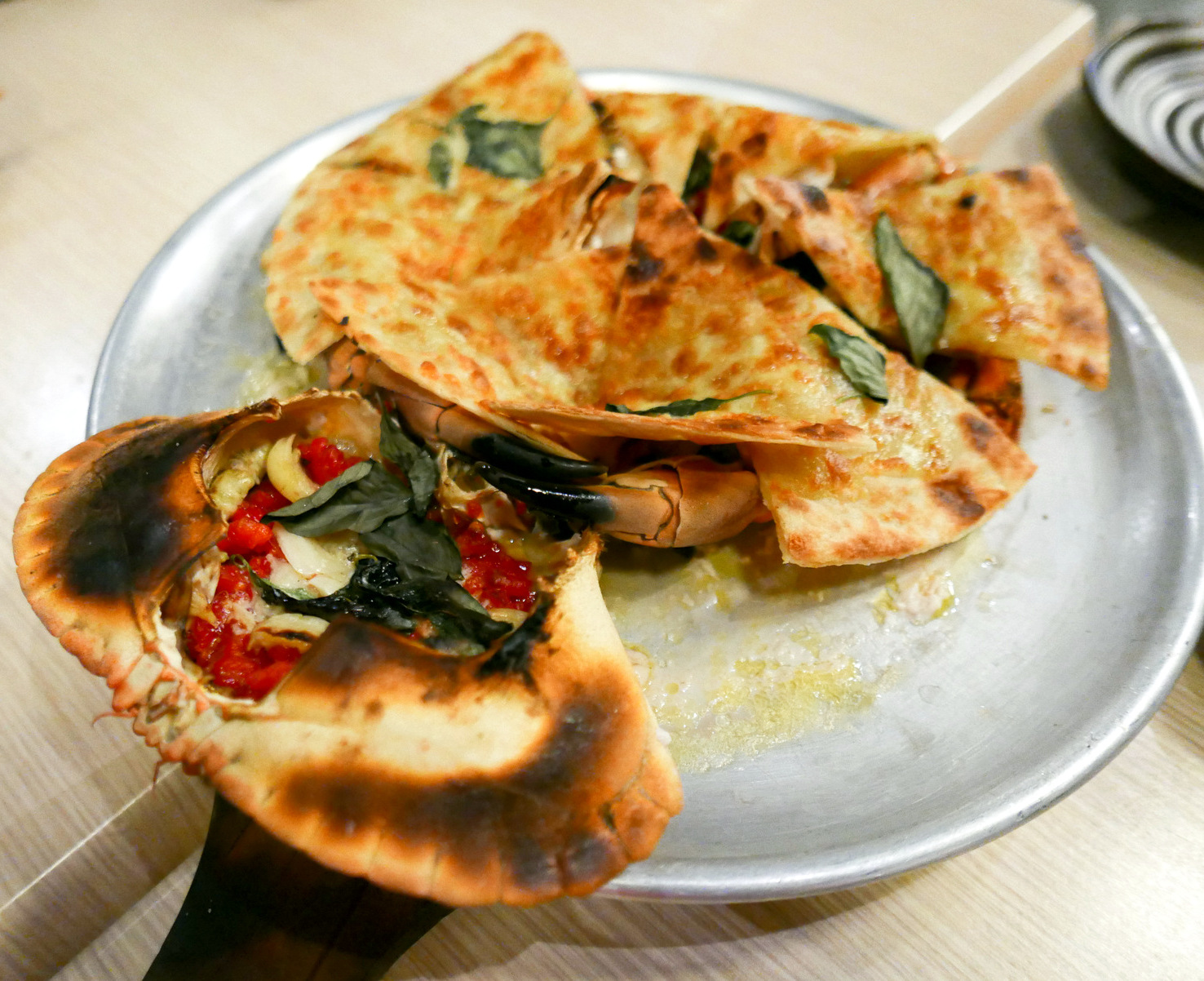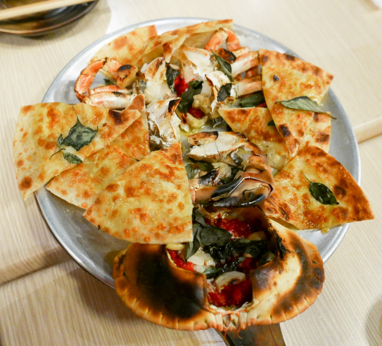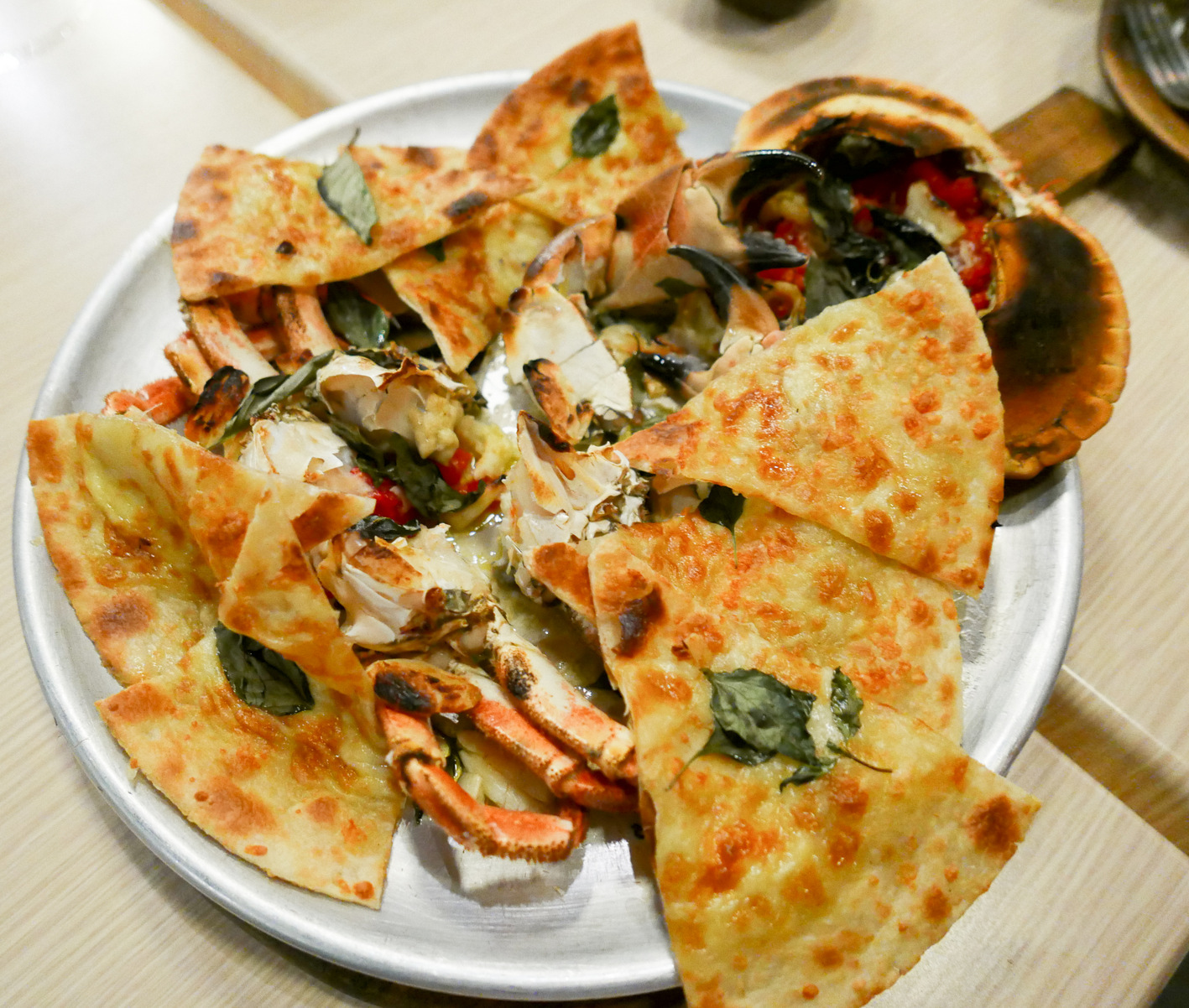 ... while giant French crabs, rich with dense roe, are treated even more unconventionally, camouflaged in oily slices of flat-bread that evoke a cross between Italian pizza & Indian naan. A diet-destroyer, by every possible measure. RM138++.
