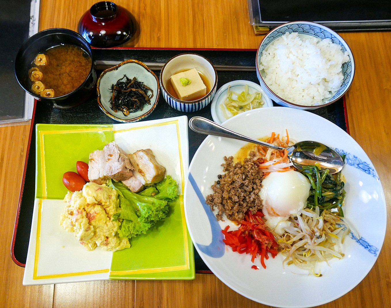 We enjoyed our salaryman's lunch - Yoshinari's take on bibimbap was tasty, a medley of beef, vegetables & soft-boiled egg, meant to be mixed up. Pork belly with smoked potato salad was satisfying too - luscious meat & soft carbs. But not everything was a success: the beef hamburg steak was too gamy; the tuna & scallop sashimi was only OK (Yoshinari says it secures its supply from Tsukiji market). Still, the hits outnumbered the misses - both the lightly battered chicken laced with red pickled ginger & the simmered flatfish were moist, delicate & delicious. Shochu mixes are available, blended with green or oolong tea.