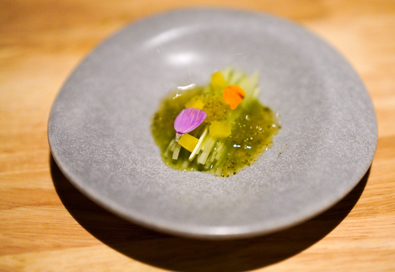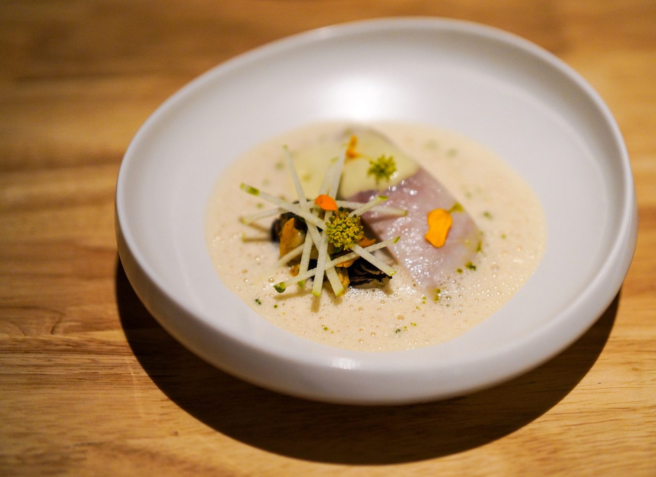 Our favourite dish follows: Cornish chicken, indulgently fleshy-chunky, grilled to a light but nectarous caramelisation that evokes the most lip-smacking yakitori, a delight with Asian-inflected accompaniments of okoge - scorched, crusty rice with a short-grained starchiness - showered with salted sawi and a thick, rich sauce of crown daisy, better known as chrysanthemum greens. Protein, carbs and fibre, in a combination of components that work well both independently and in unison.