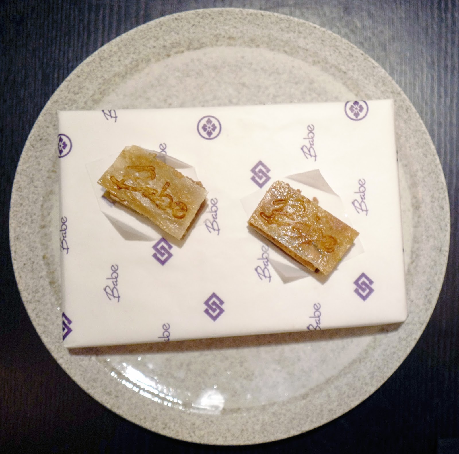 Babe's Duck & Coke might sound like a drinking challenge, but it's a sweet-savoury little delight, a crispy chicken skin wafer sandwich that's layered with foie gras, duck confit and a Coke-infused strip that bears Babe's own imprint.
