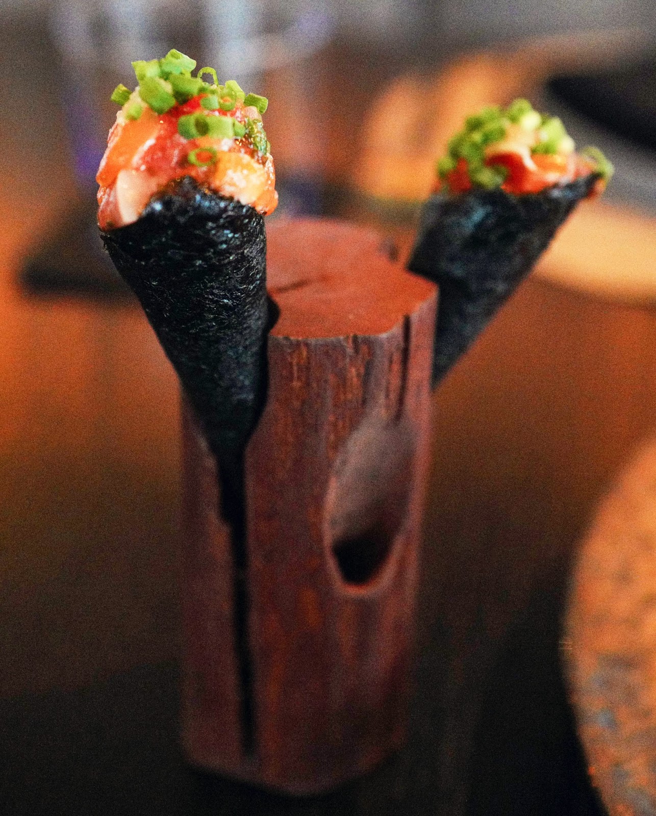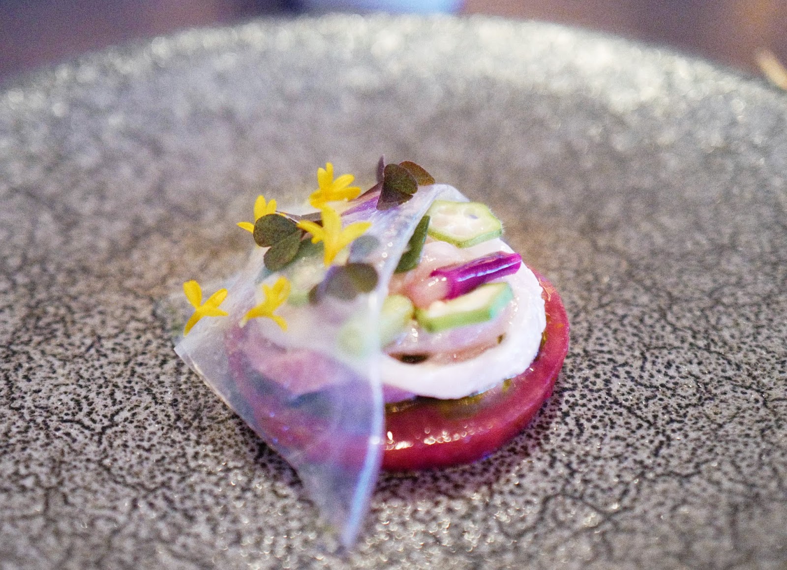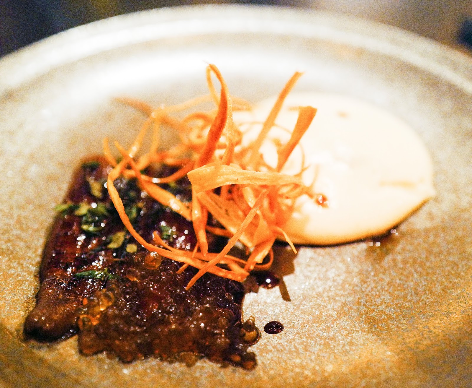 Babe recently launched its Fall/Winter menu, relying partly on produce that's presently at its seasonal peak in Japan. We'll get to some of that later, but the feast kicks off with the Lomi Lomi Salmon, a nod to a year that Ramsey once spent cooking in Hawaii - this is the perfect appetite-rouser, stuffing salted salmon with tomatoes and allium into a crispy nori cone for a burst of bright, punchy flavours.