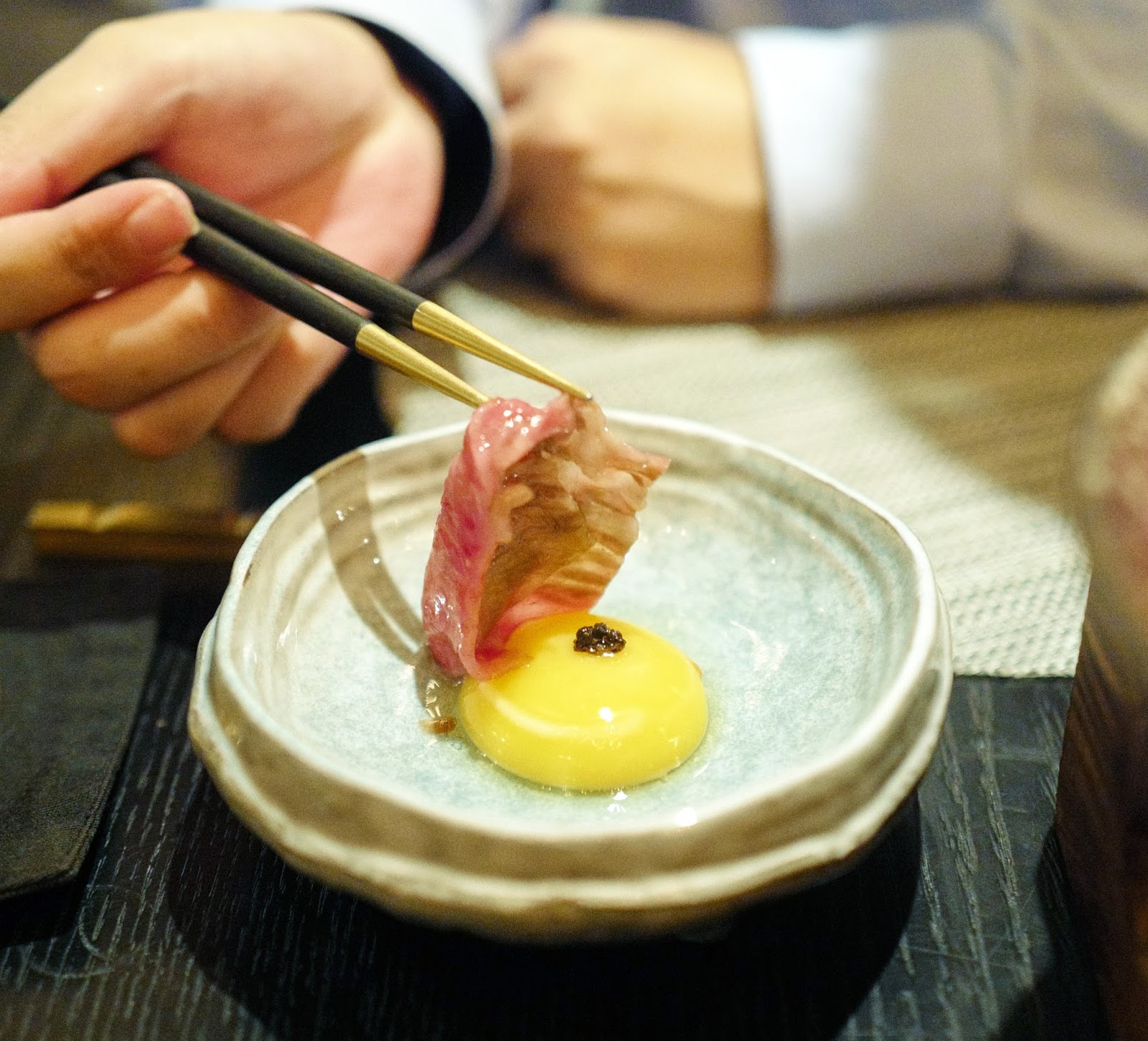 The show-stopper is protein that you can cook at your table - the Kagoshima A5 heritage beef is prepared in a modern homage to sukiyaki, each slice ravishingly marbled and achingly luscious. It's simultaneously delicate and decadent, tipping over to the latter with the final flourish of a truffled onsen egg for dipping. We'd happily have this again and again.