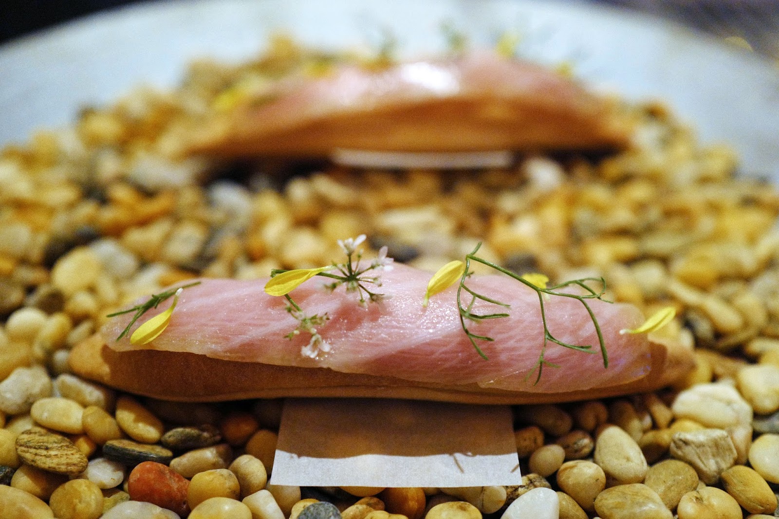 There's also whimsy and joy bundled into the Prawn Siu Mai, with its outer layer of translucent purple potato that's fried instead of steamed, serving as a cup for prawns and cous cous, a delicious mouthful that's delightfully laid on pebbles that look like candy of endlessly vivid hues.