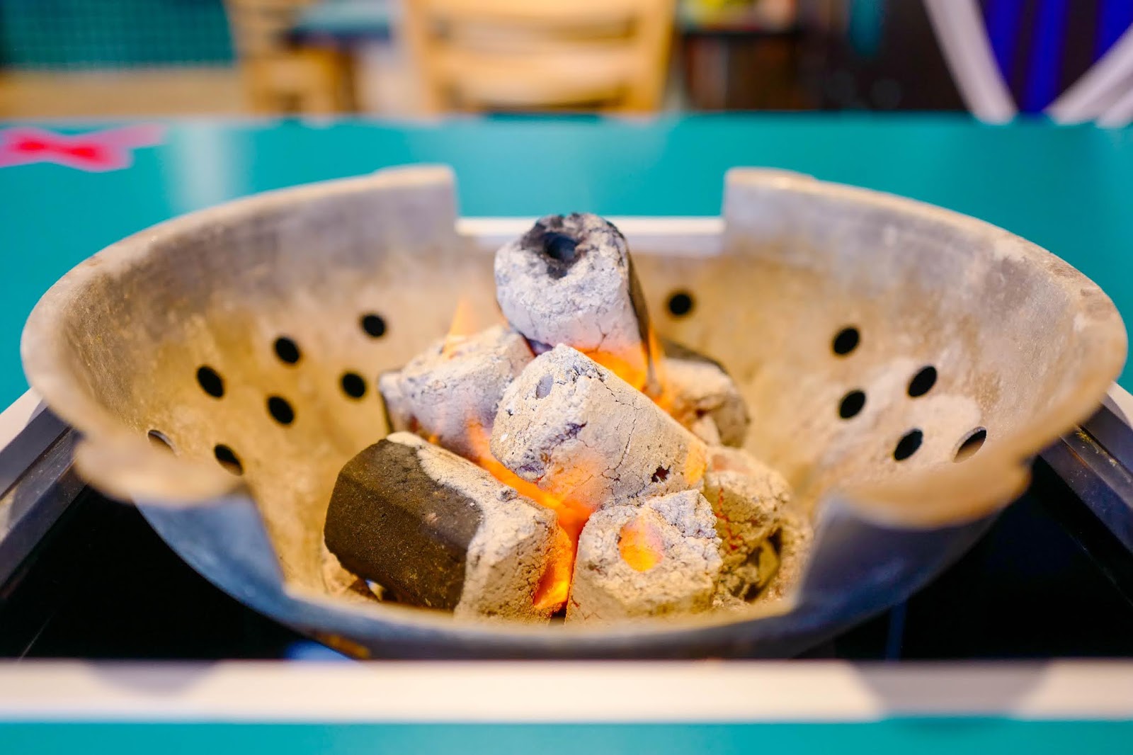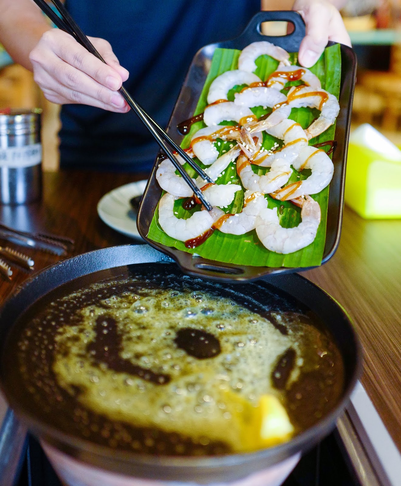 Grease the dome in the centre with chunks of pork fat, then grill your slices of savoury pork belly till they're sizzlingly succulent, ready for dipping into the restaurant's own-blended nam chim suki sweet-sour chilli sauce for a smoky-spicy affair.