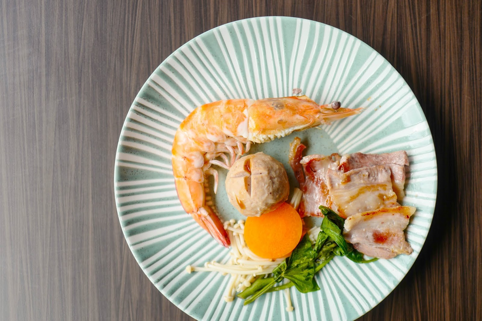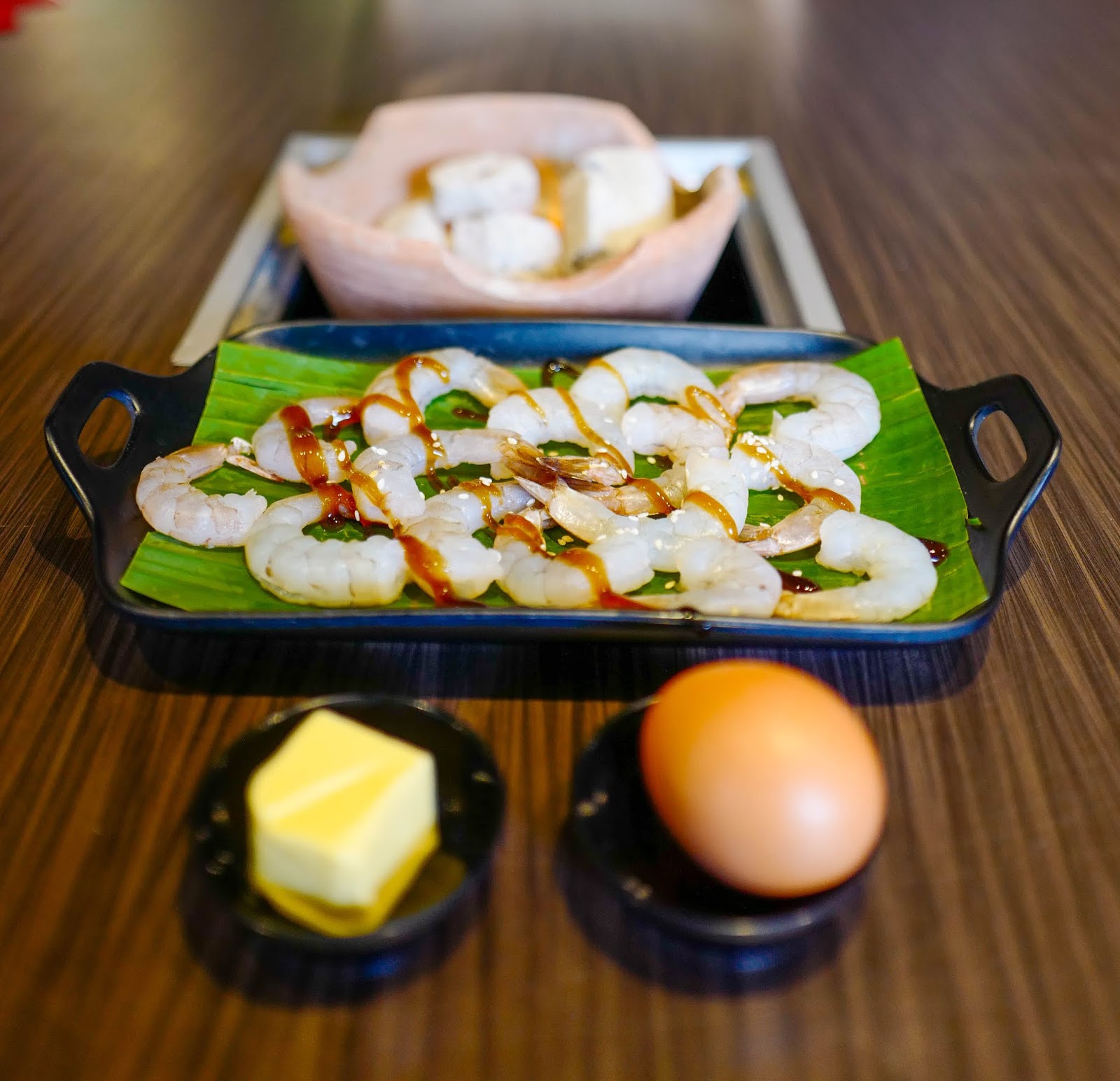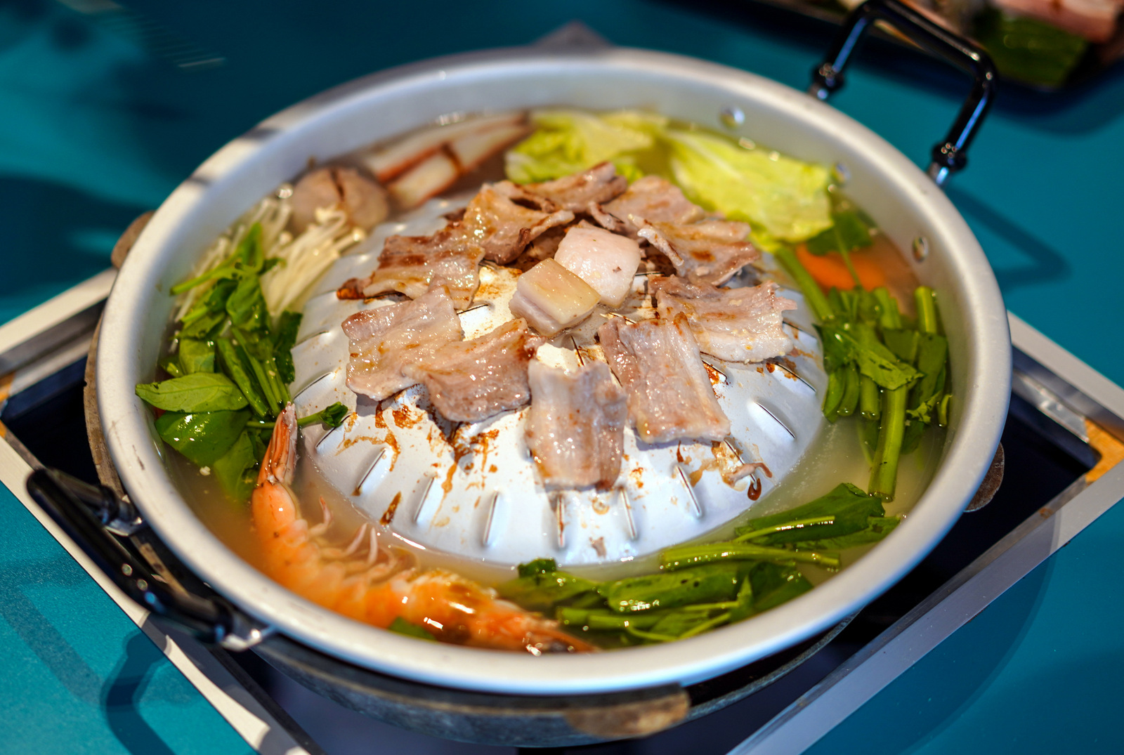 Tiger prawns, meatballs and vegetables can be cooked in a choice of original pork broth or tom yum soup. This nourishingly balanced portion should easily satisfy two persons, with the pork, seafood and meatballs each served in 100-gram portions.