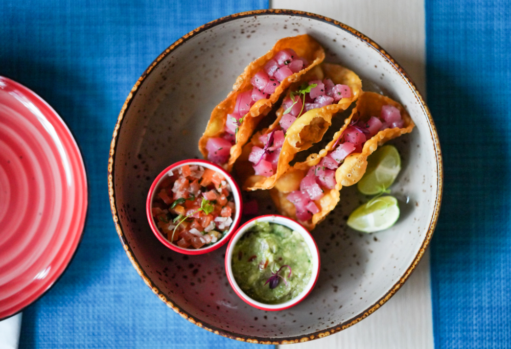 Blu Apron puts a playful twist on its treats - start with the mini tuna tacos, with fresh maguro, marinated ceviche-style, its tenderness contrasting with the crunch of fried wonton wrappers in lieu of tortilla shells, rounded out with pico de gallo salsa and capsicum guacamole for a fun, lively ensemble that fans of mod-Mex will relish (RM32).