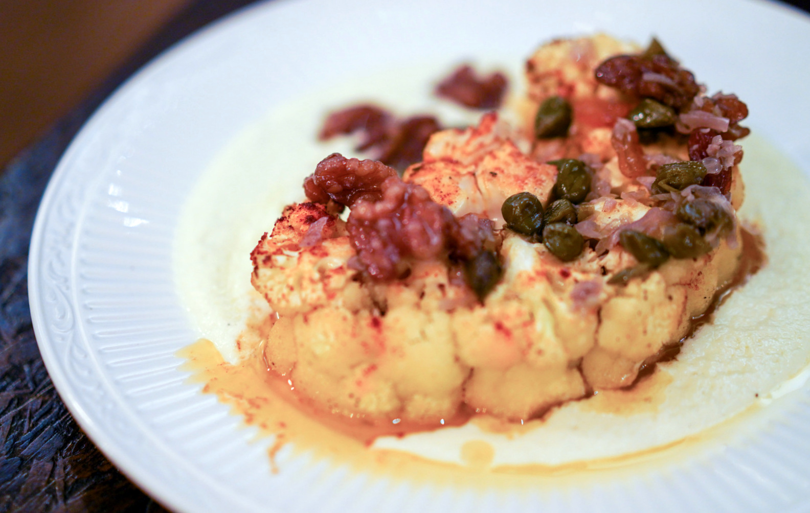 If you prefer a vegetarian 'steak,' the cauliflower is a hearty choice, chunky and crunchy, complemented by creamy cauliflower puree, walnuts, raisins and hints of truffle oil (RM24).