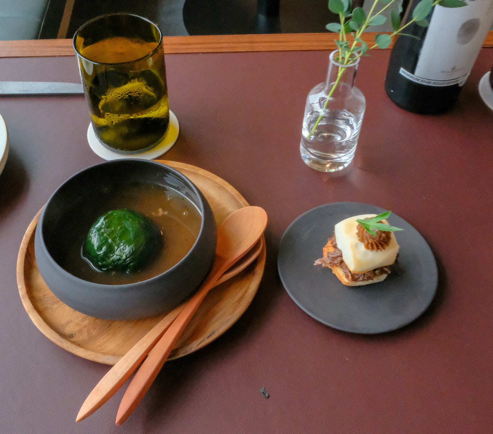 The menu is in a soft-launch stage, but there's still plenty to pick. After settling in with house-baked bread (warm and soft) with kombu butter (smooth and briny), plus an amuse-bouche set that might include a gazpacho raindrop cake and lamb pave fritter laced with mushrooms and cheese, start with two top temptations that encapsulate Entier's ethos: ox tongue and ox tail.