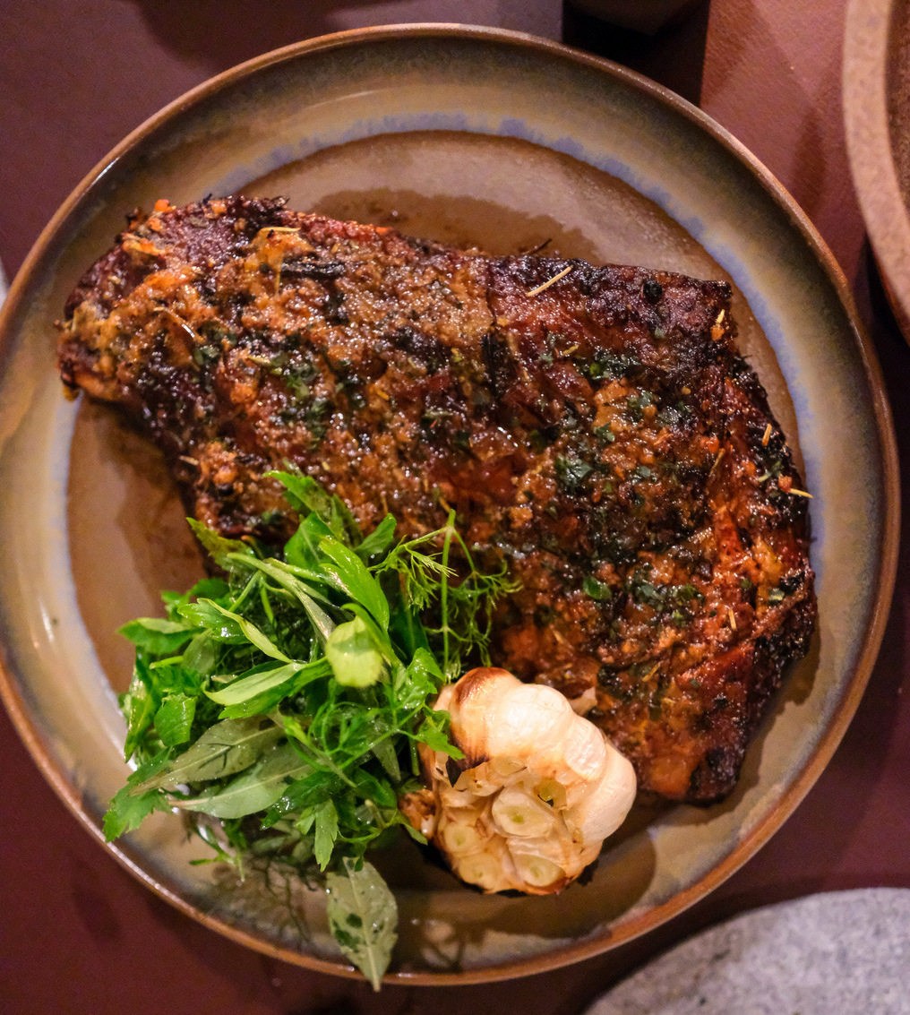 Back to red meat: Baked beef marrow is served with an Australian flank steak tartare, quinoa and egg yolk confit for a dose of decadence that's ideally shared (RM37), while honeycomb tripe surfaces as a double threat with a yin-yang perspective, crunchy-fried on top and braised at the base, with betel leaves and tripe jus (RM28). Lamb emerges in the form of belly meat, weighed down somewhat by a heavy miso sauce, with charred garlic and herb salad on the side (RM89; we ordered a 'small,' but were presented with a 'medium,' which was too much for two persons).