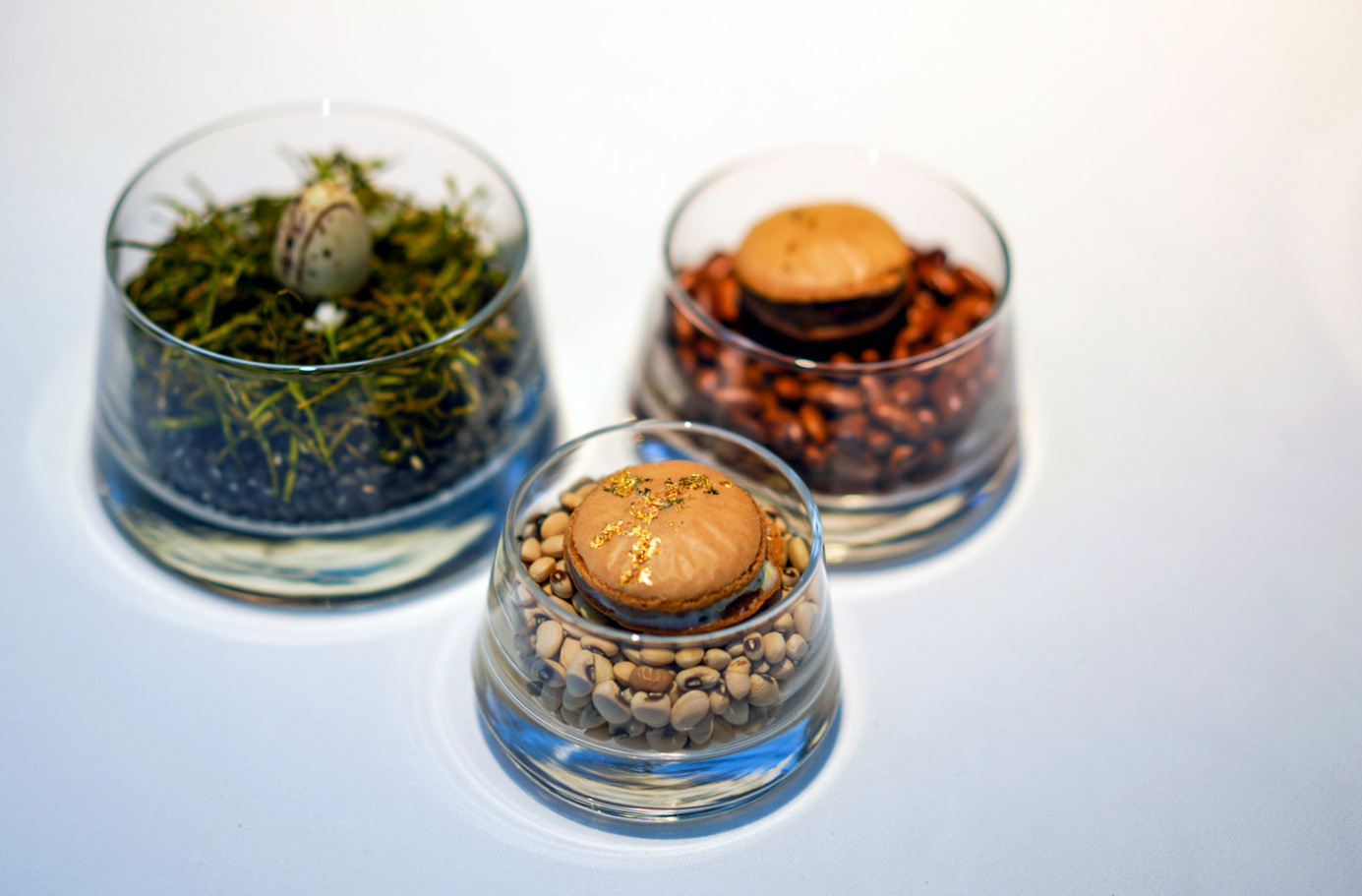 Beside them come imperfect, incomplete, broken macarons with clearly mended cracks, one layered with dried figs and aged pomegranates, representative of winter fruits, the other with yogurt and lemon zest. A captivatingly enhanced ensemble that conjures authentically Indian aromatics.
