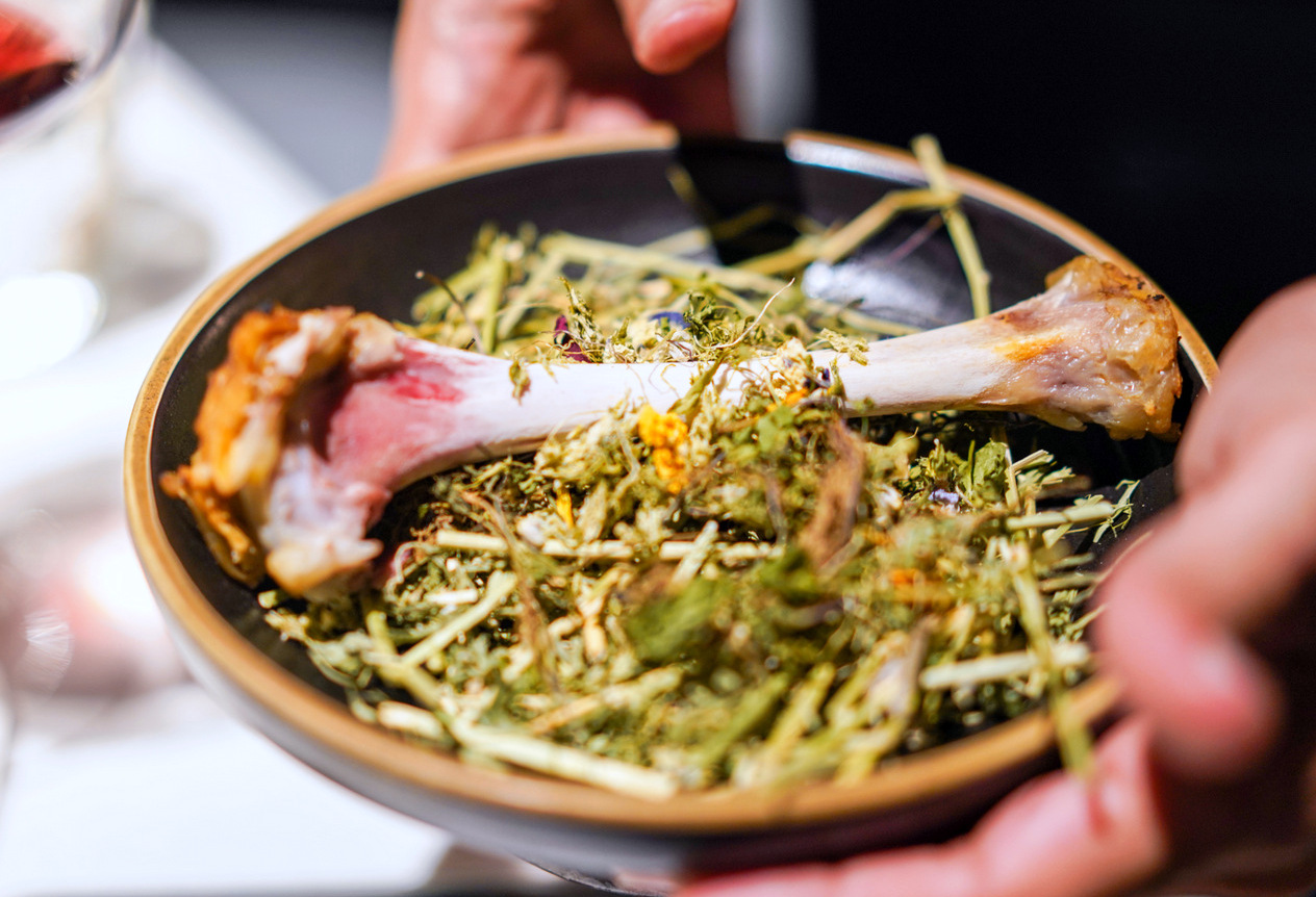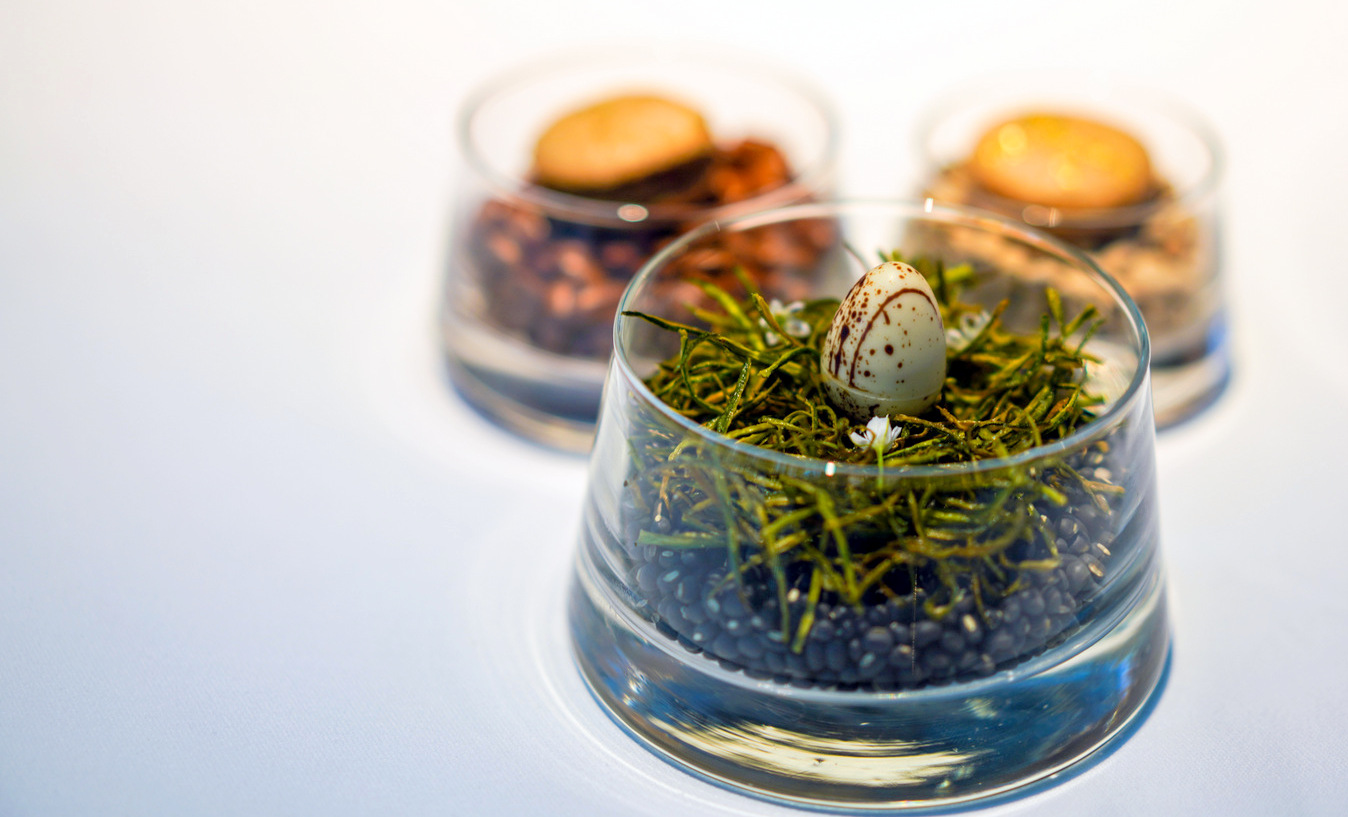 Following rustically textured rye and walnut bread matched with a buttery-creamy blend of maska yogurt and 12-year-aged balsamic vinegar, our first course is an amuse-bouche that reads 'bird's nest, kintsugi' on the menu, summoning visions of swiftlet saliva in lacquered pottery.