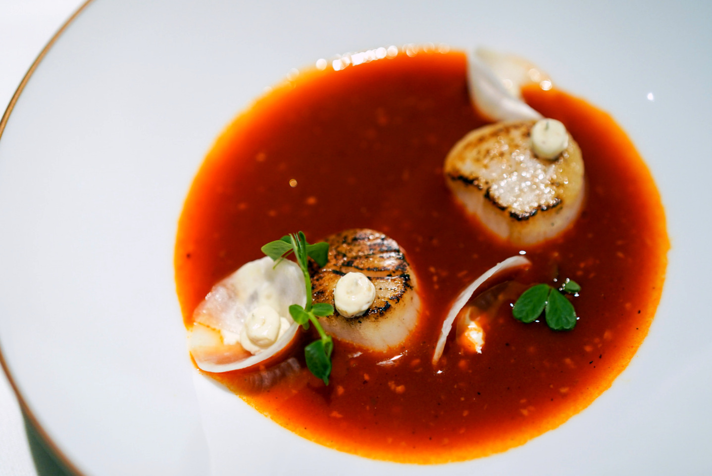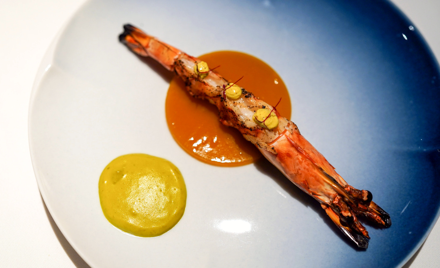 The ocean continues to be the cornerstone of the third course, called Bitterness - tandoor-cooked prawns, subtly smoky from charcoal, draped over pumpkin jelly and dotted with the extract of bitter-nutty fenugreek leaves that warm the body. The Indian-cultivated leaves are flown weekly into Malaysia, testifying to Yogesh's devotion to produce that best reflects his homeland.