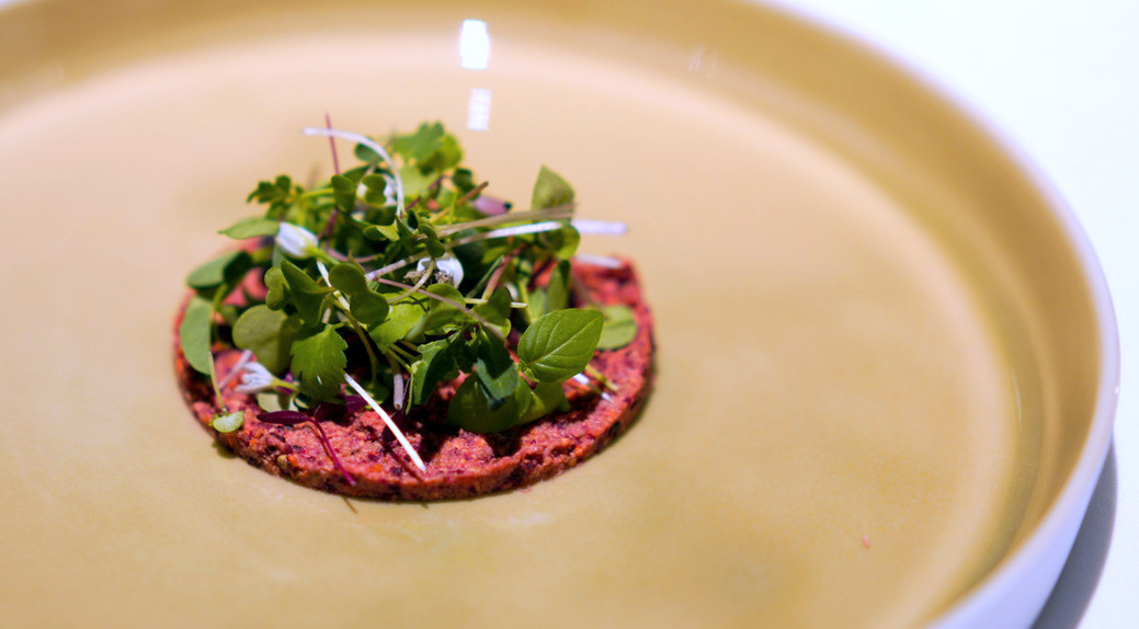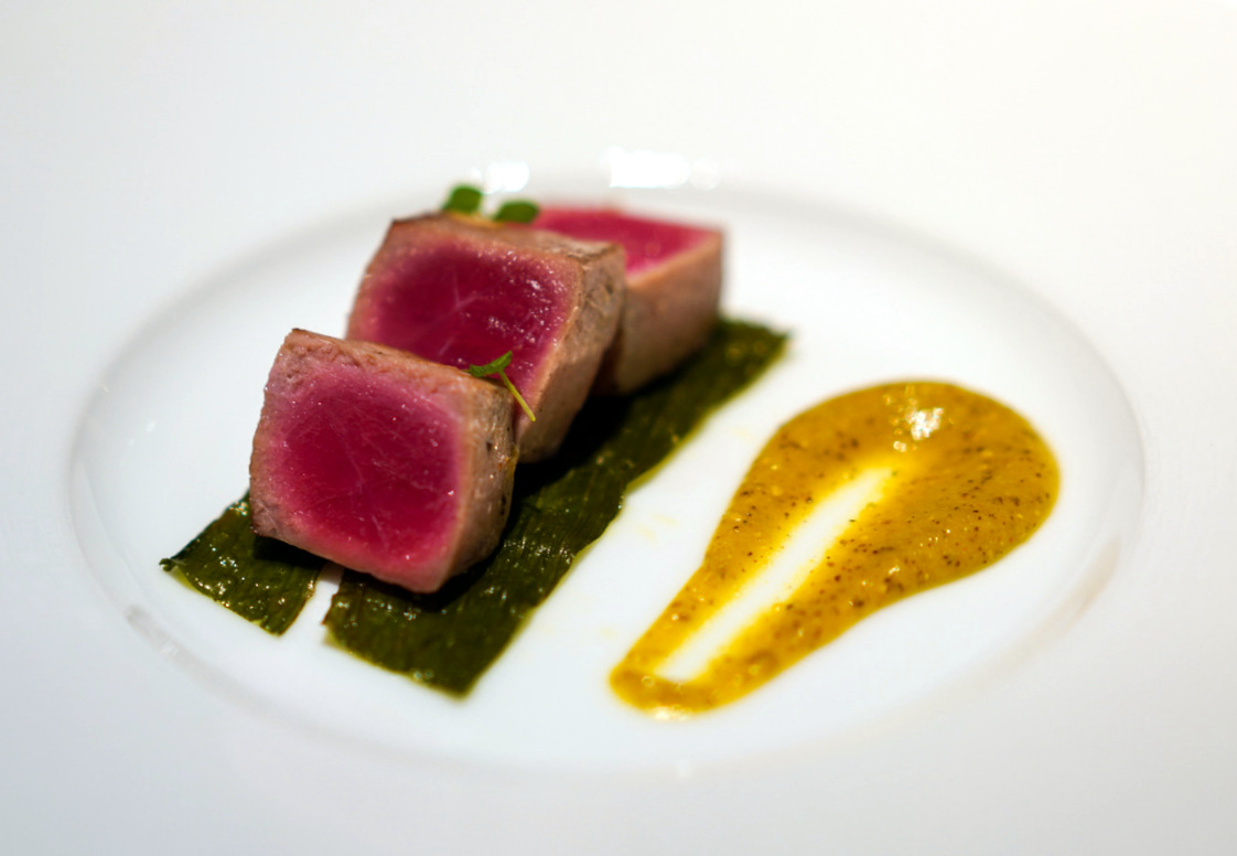 Returning to the degustation, lucky number seven sees Japan Meets India for yellowfin tuna from the Land of the Rising Sun, served tataki-style with a gentle sear, laid atop turmeric leaves instead of nori, with a sauce of Bharata-born mustard on the side instead of wasabi.