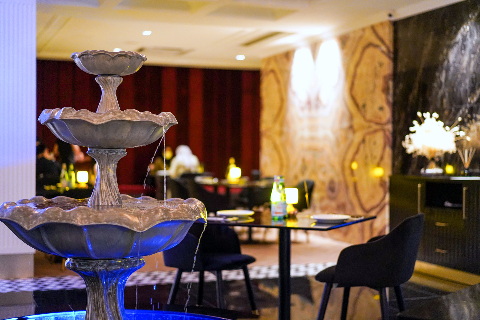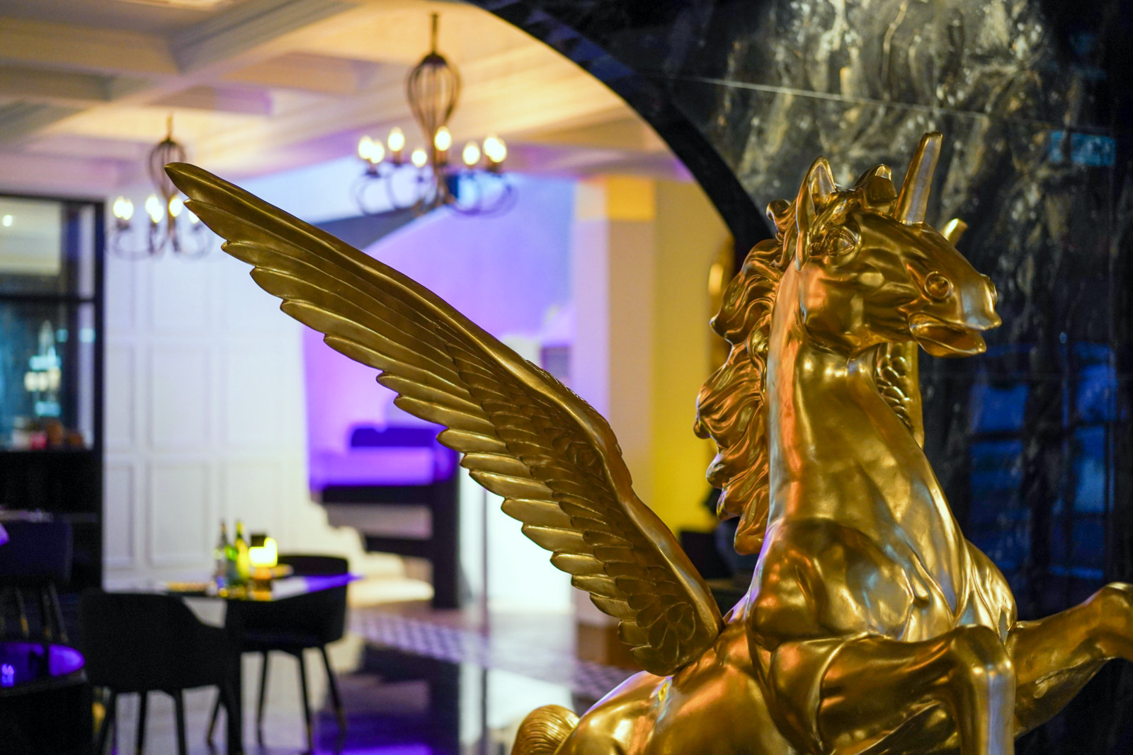 A winged unicorn, gold-hued and life-sized, greets guests inside the entrance, a symbol of good fortune. The main dining hall beckons visibly ahead, complete with a trickling fountain and a full view of a 13-man kitchen, led by Yogesh - better known as Yogi - and his senior lieutenants from India.