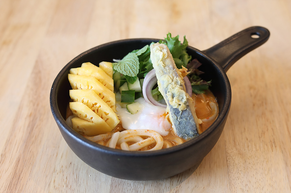 It also makes sense for g. by Forest Bean to create the unique Udon Asam Laksa, submerging the thick, bouncy noodles in a house-made laksa broth that speaks clearly of Penang, its pronounced tang accentuated by pineapple slices. This is a memorable Malaysian-Japanese hybrid, with onsen tamago and tempura-battered tenggiri for a bowl you won't find in George Town or anywhere else (RM20).