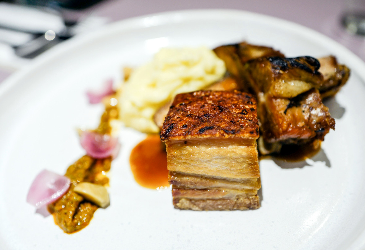 Hommage's menu is still evolving, but for now, customers have more than a few intriguing choices in the evening. Pork belly and short ribs emerge with potato puree, mild cili padi pesto, garlic confit and pickled pink shallot petals (RM38) in a distinctive sacrament of succulence that was first born as a tribute to bak kut teh, while slow-braised beef shin, tendons and tripe surface with wakame, daikon and dark jus (RM42) for an ensemble that may evoke the glorious gelatinous pleasure of beef noodles.