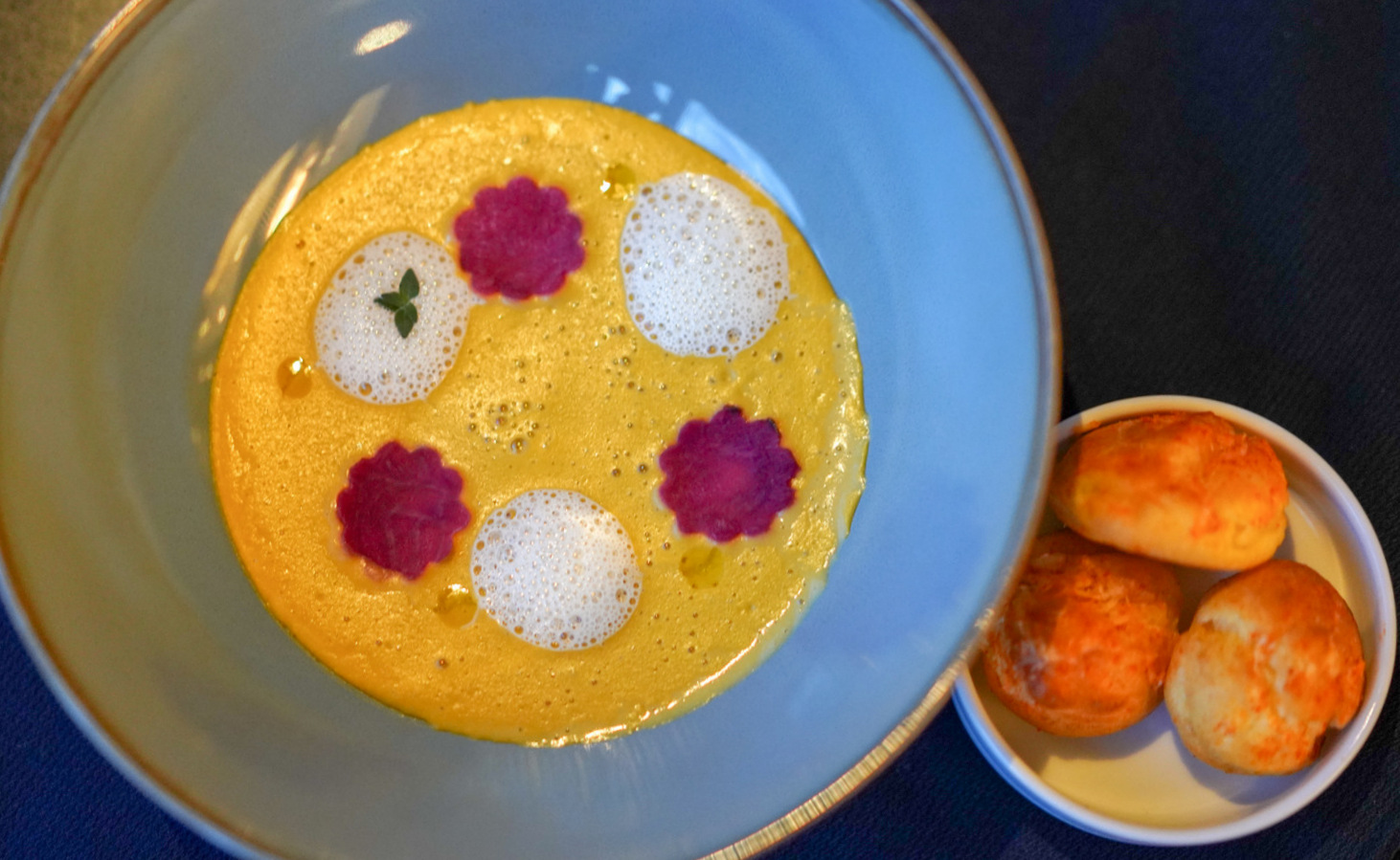 Even a potentially simple sweet corn veloute secures special treatment, potently conveying the corn's punchiest nuances, assertively accompanied by pickled purple beetroot slices, with a much-welcome bowl of piment-scented gruyere gougeres to round out the soup-and-pastry synergy.