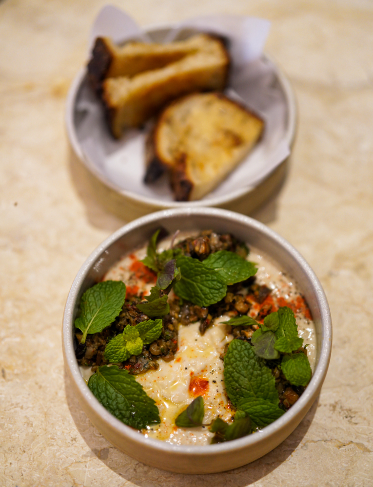 Palate-reviving pleasures include firm but juicy momotaro tomatoes with pickled white onions, hot peppers, mustard breadcrumbs and Parmesan shavings in white wine vinaigrette (RM22). beautiful boiled beets with a natural bounty of braised wheat berries, caramelised fennel, sumac and tahini yogurt sauce (RM20), and a rich hummus of blended white beans with spiced shiitake-eggplant relish and extra virgin olive oil (RM17).