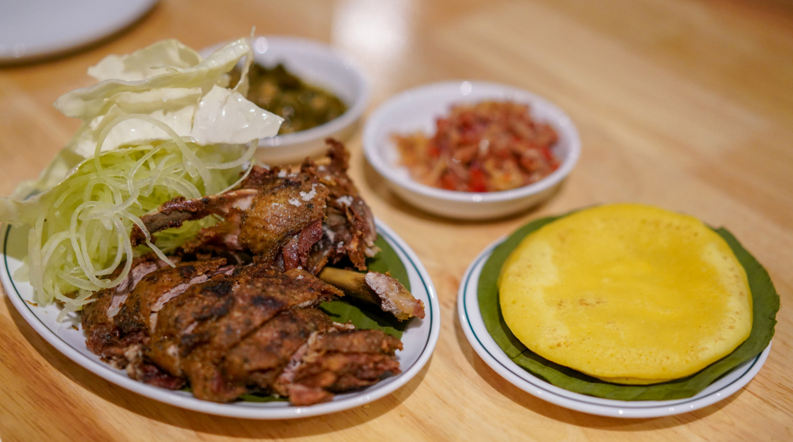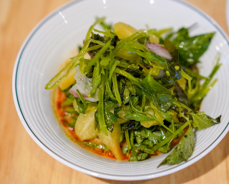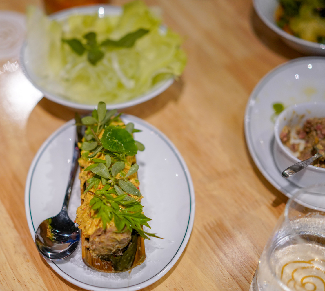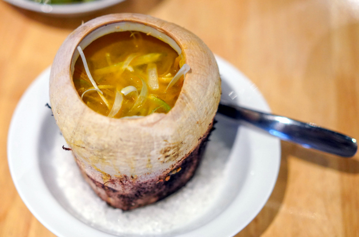 A broth of banana shoots is richer than its mainly vegetarian roots might suggest, rounded out with shredded chicken, spring onions, torch ginger, cabbage and lemon balm (RM20), while the wood-fired baby squid is a tender, tasty triumph, blanketed in ulam raja and bolstered by a roasted blue ginger curry (RM25).