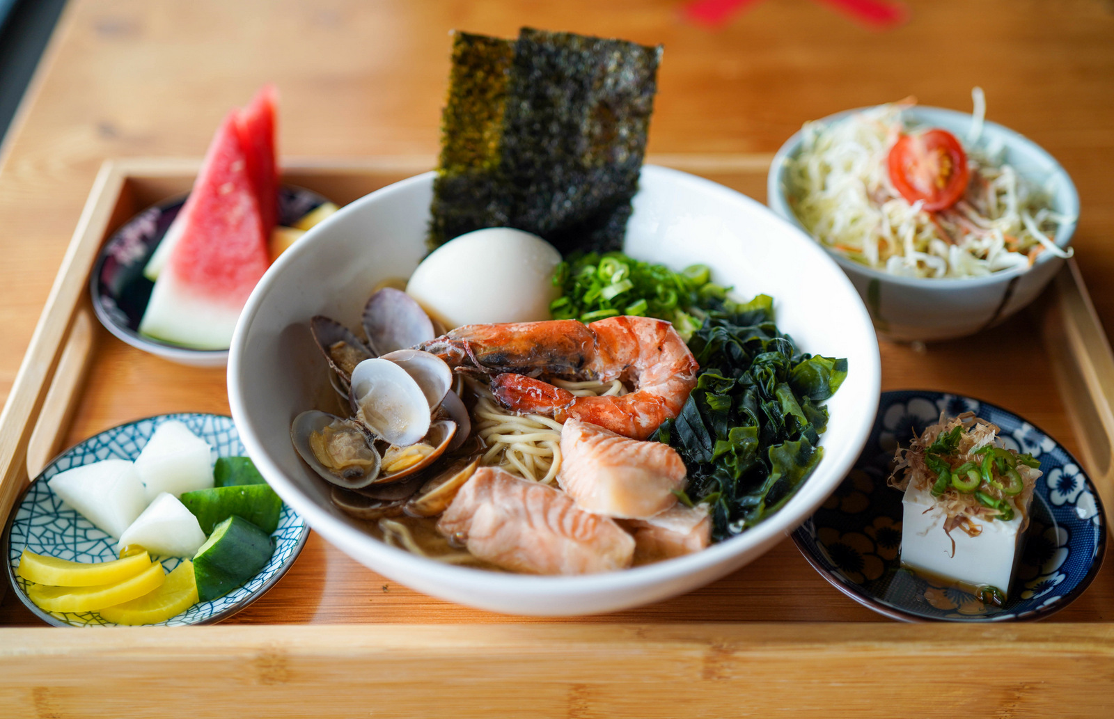 More than a dozen different sets are available, representing rice and noodle classics beloved in Japanese cuisine - everything from oyako don to unadon and gyudon, shio ramen to hiyashi udon, costing between RM17 to RM32 each, generously bolstered with a special side dish of the day, house-made pickles, crisp salad, chunky sliced watermelon, and green tea.