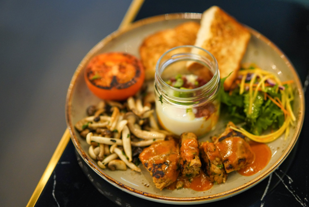 Malaya Garden's Big Breakfast is laced with likeable local touches, including soft-and-savoury chicken otak-otak patties in percik sauce, a herb-infused, ulam-inspired salad, soft-boiled egg with smoked duck chips, and house-baked coconut toast (RM26).
