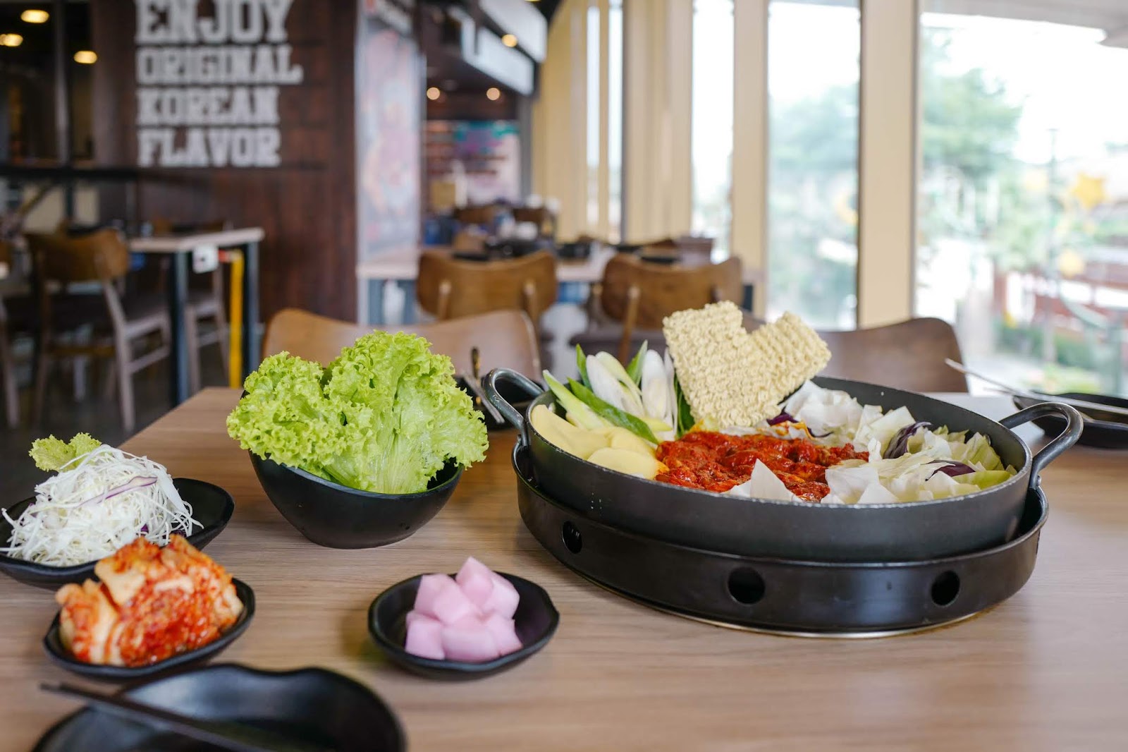 All customers at Mr. Dakgalbi dining receive unlimited banchan-style servings of kimchi, lettuce, radish and salad; you'll receive a portion of each to start with, and feel free to ask for more whenever you want.