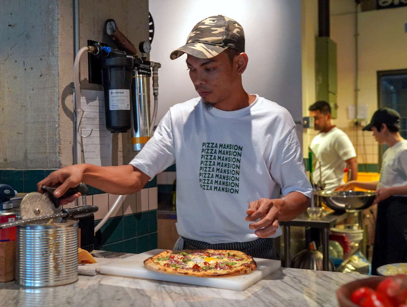 Four meat-free pizzas are currently served; at least one is drop-dead delicious. Roasted peppers, zucchini, eggplant, chickpeas and chopped chives come together with garlic yogurt in mellow, earthy harmony, made a full-bodied pizza with a beautifully stretchy blend of mozzarella and aged parmesan, rounded out with romesco sauce that embodies luscious tomatoes (RM28). Splashes of Pizza Mansion's own herbaceous basil and spicy chilli oils offer a livelier, even more nuanced experience.