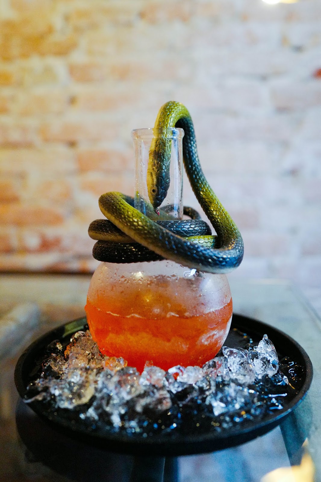 Springing straight out of the Goblet of Fire, Lord Voldemort's murderous snake Nagini strikes through Nagini's Venom (RM40). Potions describes this as a blood-replenishing elixir to counter the snake's potent poison - this supremely striking cocktail is prepared to evoke the look of the snake's venom dripping into the drink, bringing a bittersweet end to a blend of sake, aperol, campari, citrus juice, fresh orange wedges and carbon dioxide.