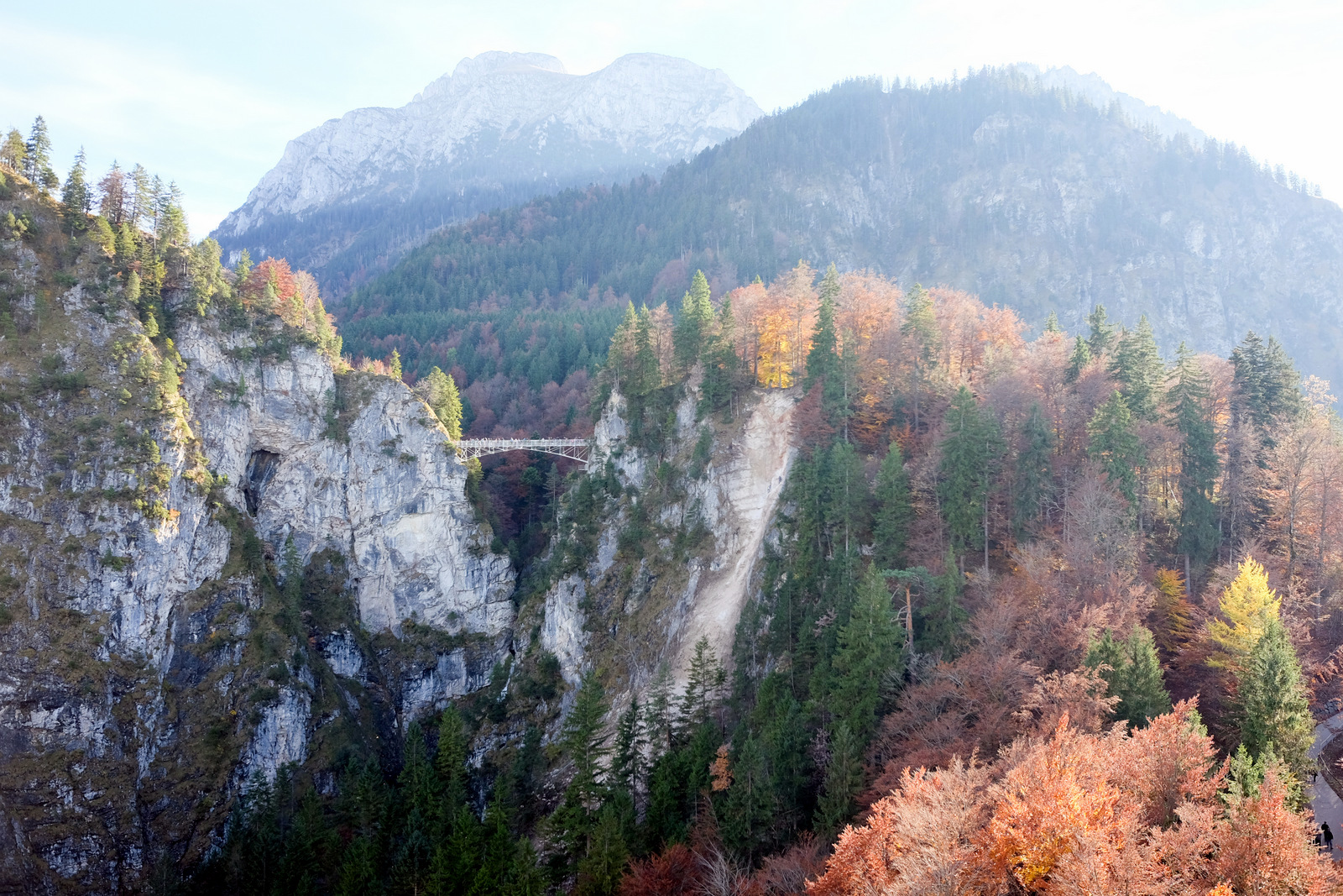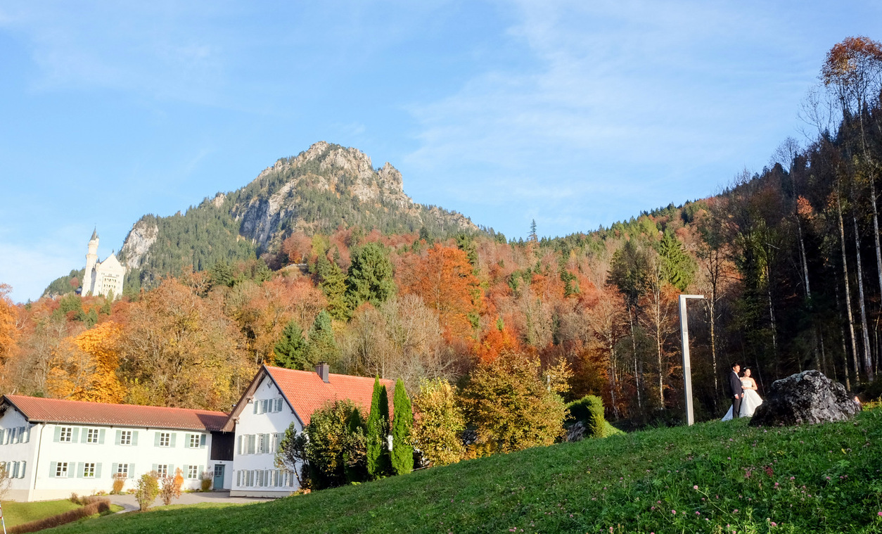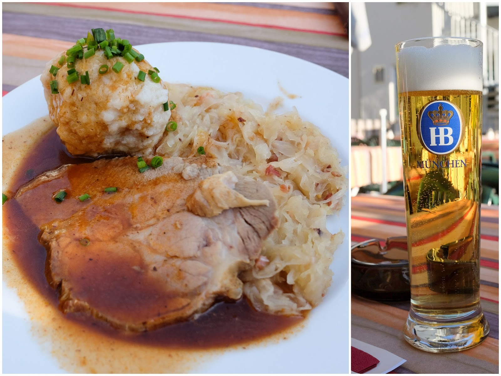 A table at Schlossrestaurants courtyard affords a very attractive view of Bavarias Neuschwanstein Castle; the eaterys speciality of roast pork with dumpling & sauerkraut might be much less photogenic, but thankfully, it tastes better than it looks.