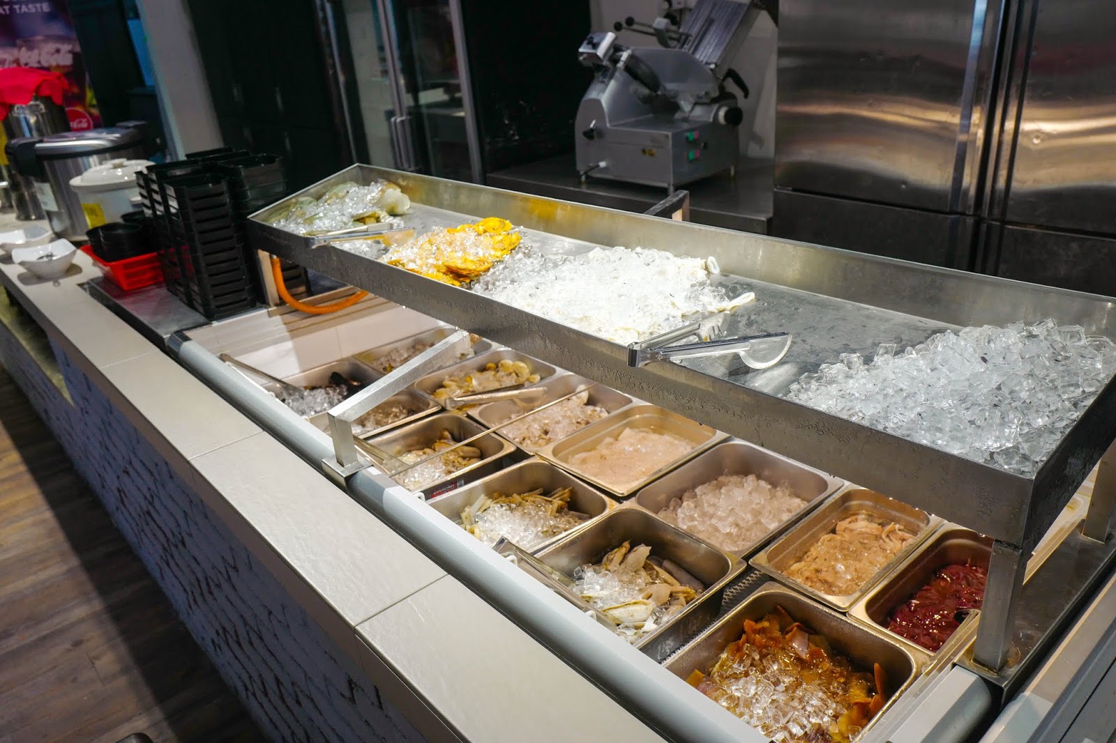 Meat and seafood are chilled to maintain freshness, mostly locally sourced from the markets every two days. Temptations span pork belly, beef slices and oyster mushrooms to marinated specialities like rice wine chicken and curried dory fish to clams and mussels of different shapes and sizes on ice.